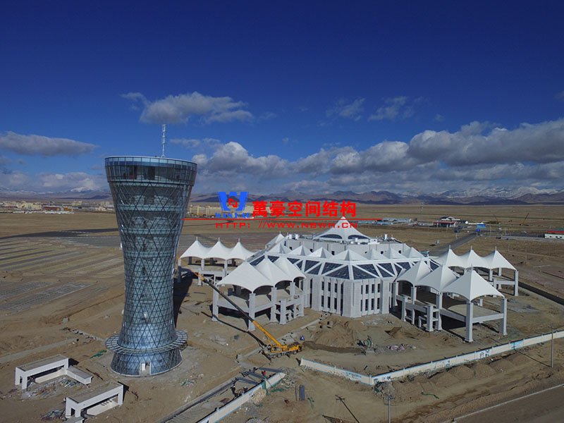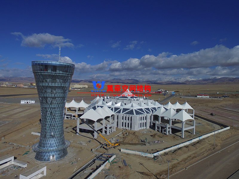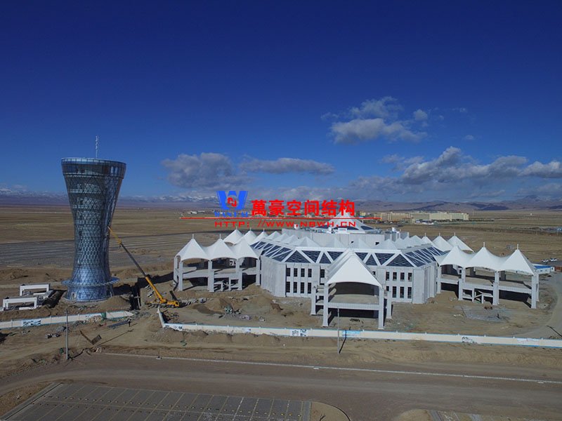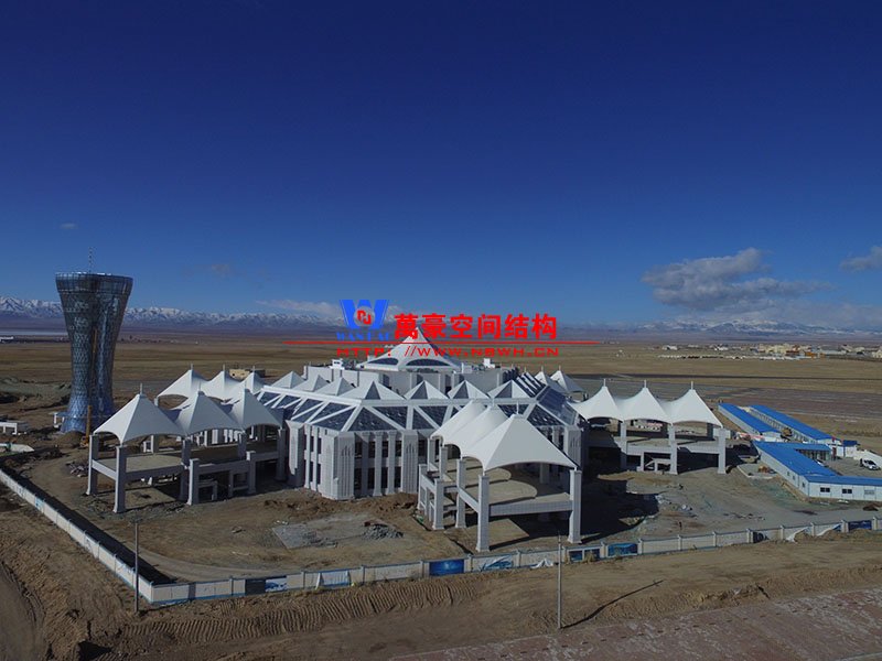 青海茶卡鹽湖天空之境集散中心鋼膜結(jié)構(gòu)項(xiàng)目位于擁有中國“天空之境”之稱的茶卡鹽湖。該項(xiàng)目分小蠻腰觀光塔和六角主樓兩部分,其中小蠻腰觀光塔由雙曲面空間鋼結(jié)構(gòu)相互交叉形成幾何形的外掛玻璃組成,主樓由雙曲面穹頂及6條連廊組成。鋼結(jié)構(gòu)跨度35米,鋼膜總面積28000平米,鋼結(jié)構(gòu)用鋼量1100噸。建筑內(nèi)部空間明亮通透,遠(yuǎn)觀猶如大漠孤煙中的鹽湖之晶,近觀仿佛置身于鹽湖中的浪漫滿屋。