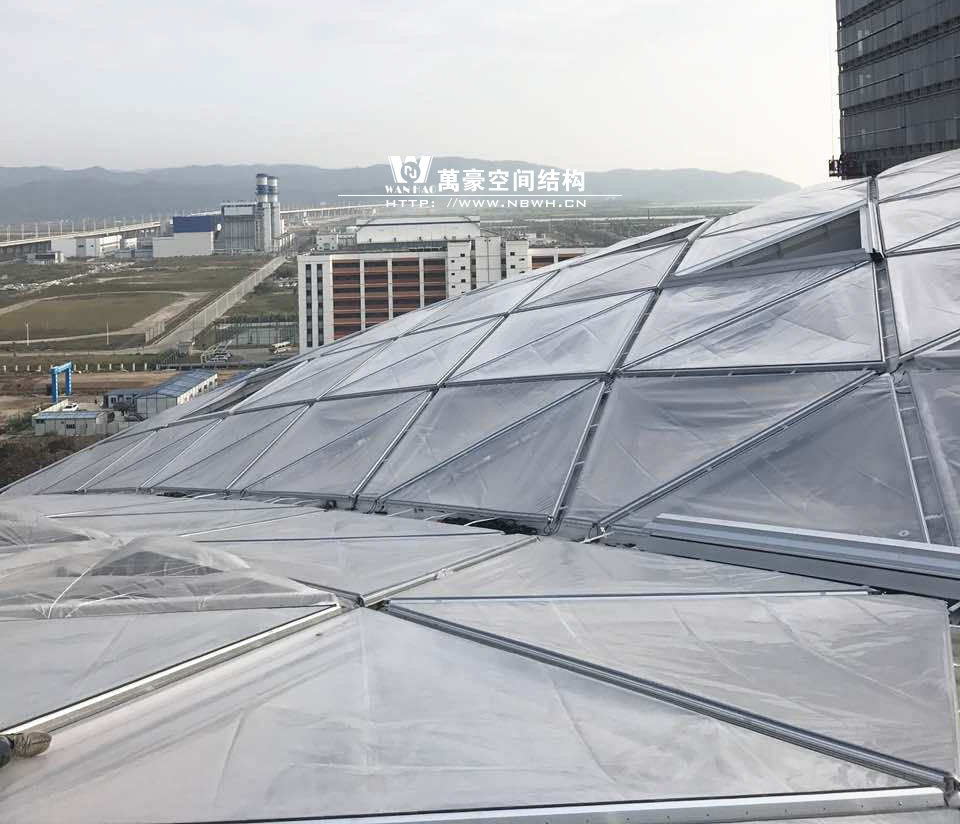 橫琴國際科技創(chuàng)新中心膜結(jié)構(gòu)工程位于廣東省珠海市橫琴新區(qū)。本工程一期用地面積22119㎡,總建筑面積63486.63㎡。建筑高度為36.5m,結(jié)構(gòu)形式為骨架式氣枕膜結(jié)構(gòu);上部為鋼結(jié)構(gòu)單層雙曲面鋼網(wǎng)殼+雙層ETFE氣枕膜覆蓋,氣枕總面積約23000平方米,共計(jì)750個ETFE氣枕,93個開啟式天窗,3000多根桿件組成,用鋼量2000多噸,單體構(gòu)件大結(jié)構(gòu)復(fù)雜。