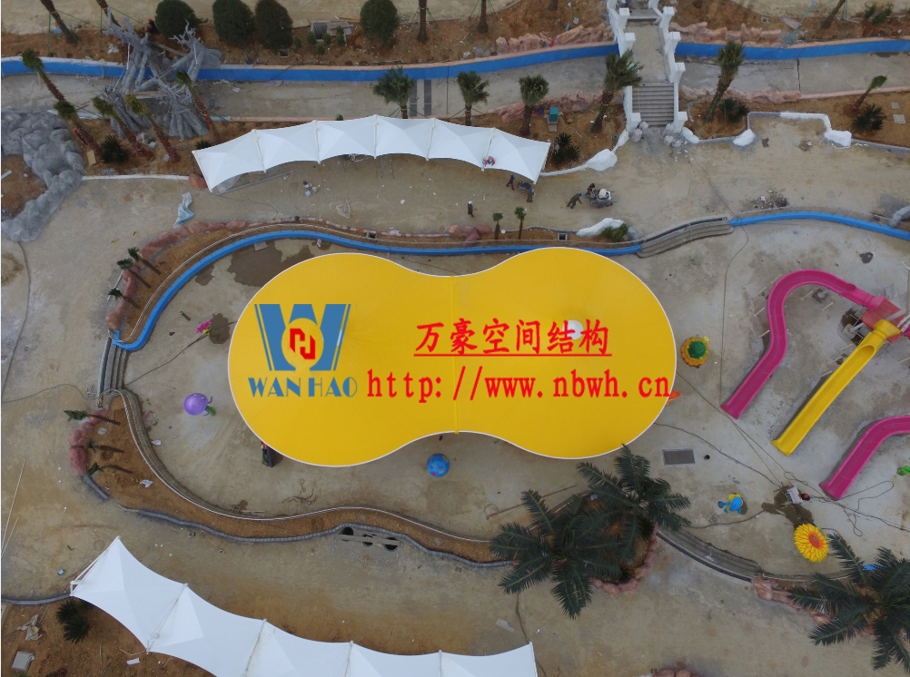 海闊天涳水世界位于浙江省象山縣大目灣新城,北與松蘭山國家“AAAA”級風景旅游區(qū)相接,東臨大目洋,南連東陳鄉(xiāng),距象山縣城8公里,成為大目灣新城最先動建的重大膜結構功能性項目,由寧波萬豪空間結構工程有限公司承建。現(xiàn)場測量、深化設計、制作及安裝由寧波萬豪空間結構工程有限公司全權負責;用鋼量高達180噸,建筑面積達5000平米。