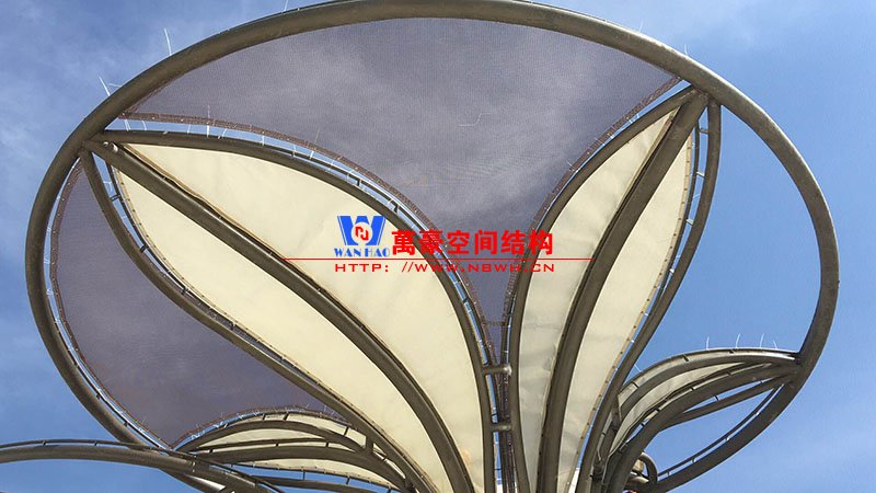該項(xiàng)目膜結(jié)構(gòu)共有9個(gè)單體結(jié)構(gòu),分別由1個(gè)大型花朵、4個(gè)中型花朵、4個(gè)小型花朵組成,膜結(jié)構(gòu)建筑面積約為400平方米。