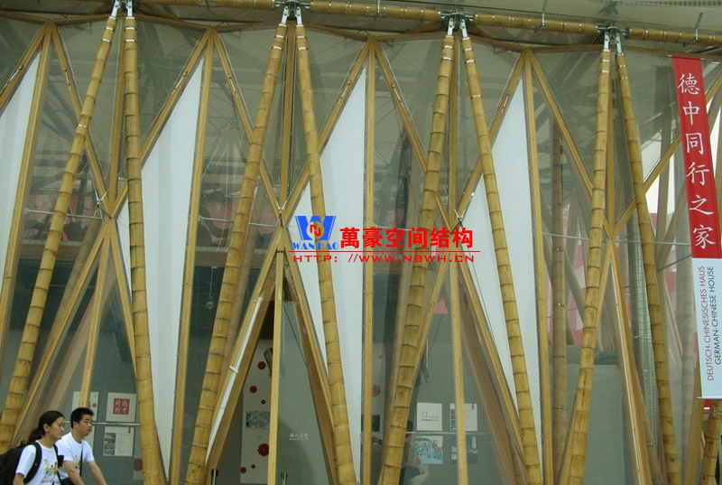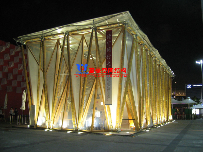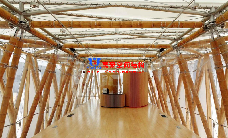 德中館展館膜結(jié)構(gòu)內(nèi)部樓板由膠合竹板制成的巨型梁柱體系架構(gòu),其連接構(gòu)件及表面處理技藝均為此建筑量身打造。高達(dá)六米的梁柱將建筑內(nèi)部進(jìn)行二次分割,營(yíng)造出獨(dú)立的二層樓面空間。竹桿支撐體系在建筑屋面層通過鋼節(jié)點(diǎn)相互連接固定。屋面面層采用PVC 膜覆蓋,墻體結(jié)構(gòu)則由天然竹材和透明輕盈的新型材料ETFE膜復(fù)合構(gòu)成。整個(gè)膜結(jié)構(gòu)建筑體現(xiàn)了可持續(xù)和環(huán)保的理念,易建易拆,所有材料皆可回收或重復(fù)使用;材料來源本地化,除特殊結(jié)構(gòu)件外多數(shù)產(chǎn)自中國(guó)本土。