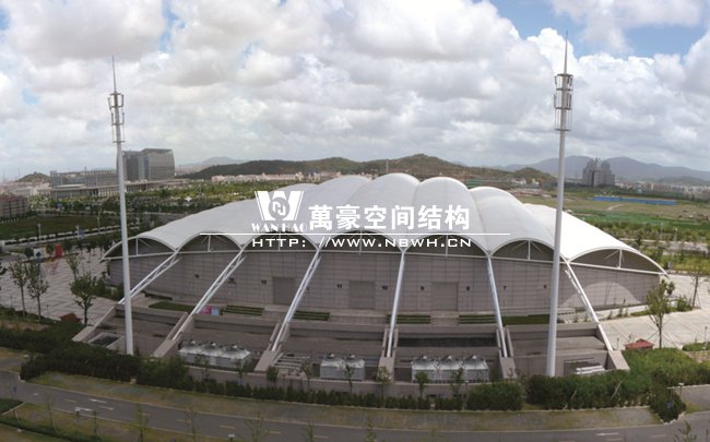頂層膜結(jié)構(gòu)分內(nèi)外膜,外膜采用PTFE材料,水平投影面積約15000平方米,局部采用PVC內(nèi)膜,覆蓋在比賽場地及觀眾席上方,工程整體結(jié)構(gòu)造型美觀新穎,與周圍環(huán)境相融洽。為寧波市獨具景觀特色的標(biāo)志性建筑。