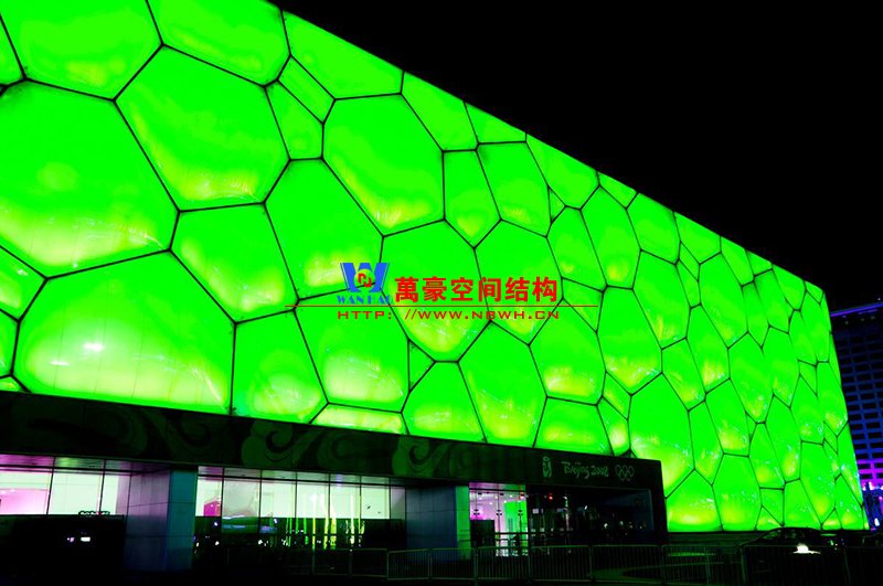 水立方是我國首次使用ETFE充氣式膜材料。在水立方尚未建造之前,我國還沒有在幕墻中使用ETFE膜材料的先例。水立方的整個(gè)建筑中除了入口處用了玻璃之外,其他地方全部采用充氣膜材料,內(nèi)部沒有一根柱子。ETFE充氣膜材料在歐洲有十多年的運(yùn)用歷史,基本上都是用在游泳館和冬季花園建筑方面的,它質(zhì)量輕、保溫隔熱性好,同時(shí)還有透光、防雨、自潔等特點(diǎn),最大的充氣膜材料建筑達(dá)3萬平方米。