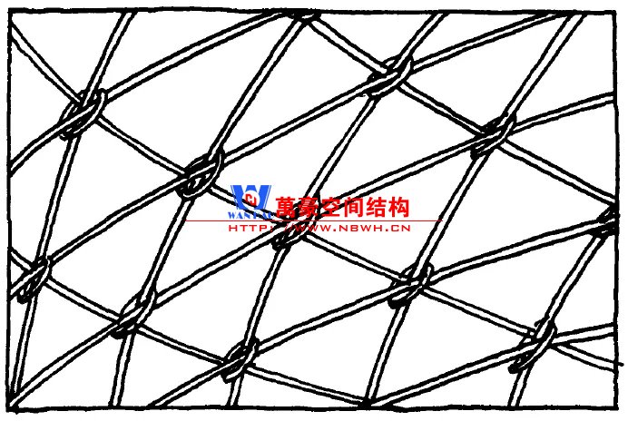 施萊希采用了四邊形網(wǎng)格劃分的球殼。網(wǎng)格桿件承擔(dān)軸力,增設(shè)拉索拉結(jié)對(duì)角節(jié)點(diǎn),保證四邊形網(wǎng)格的穩(wěn)定性。