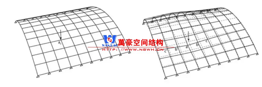 網(wǎng)殼受力方式為薄膜作用,屬于拱結(jié)構(gòu)向三維的拓展;因此,與拱類似的問(wèn)題會(huì)出現(xiàn)在網(wǎng)殼上。比如:整體穩(wěn)定問(wèn)題;不對(duì)稱荷載敏感等。