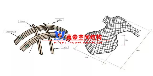 最終形態(tài)與初始形態(tài)相比,原來(lái)的正方形網(wǎng)格轉(zhuǎn)變?yōu)榱庑巍M瑫r(shí),單根5cmx5cm木條剛度很小,允許發(fā)生足夠大的彎曲變形。在達(dá)到設(shè)計(jì)形狀后,需要修整外殼的邊緣;并且在菱形網(wǎng)格中增設(shè)交叉拉索,使柔軟的網(wǎng)格成為堅(jiān)固的結(jié)構(gòu)。