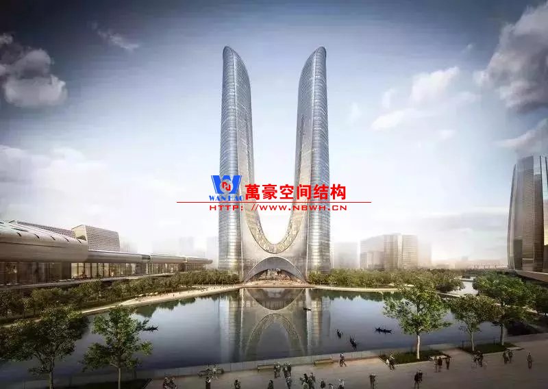 兩棟塔樓之間的底部跨度約60米,中間由約22米的鋼結(jié)構(gòu)拱連橋相接。