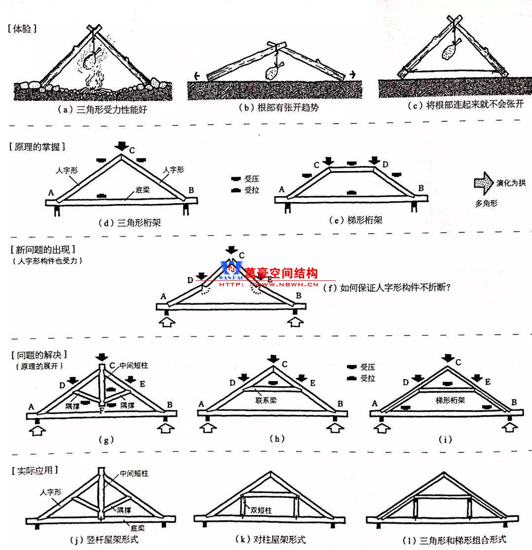 早在兩千年前,人類的祖先就發(fā)現(xiàn)了三角形的穩(wěn)定性原理,并發(fā)明了三角桁架,廣泛應(yīng)用在古代住房的木制屋蓋中。三角桁架與梁、拱一樣,是古代建筑實現(xiàn)跨越的最主要方法。