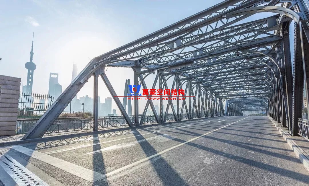 位于上海的外白渡橋是中國的第一座全鋼結(jié)構(gòu)鉚接橋梁,于1908年1月20日落成通車。該橋為下承式簡支鋼桁架,兩孔跨經(jīng)組合各52.12米,橋面鋪設(shè)電車軌道。