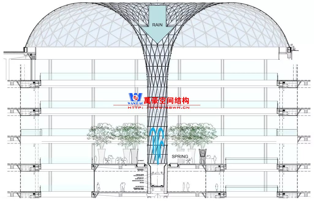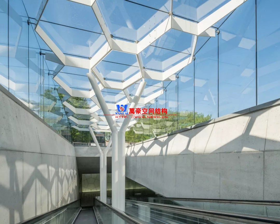 傘狀穹頂結(jié)構(gòu)充分發(fā)揮了網(wǎng)殼的形抗優(yōu)勢(shì),最小桿件截面僅100x100mm,營(yíng)造出建筑師非常期待的精致輕盈效果。
