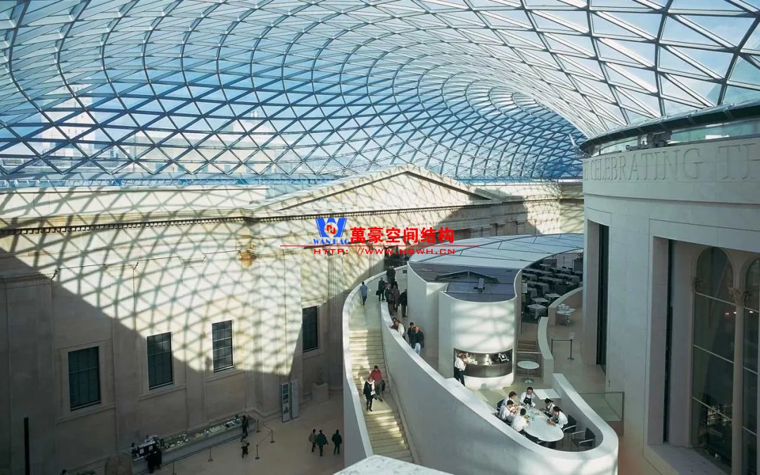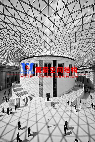 這個(gè)經(jīng)典的改造項(xiàng)目把輕與重巧妙組合。鋼結(jié)構(gòu)網(wǎng)殼內(nèi)側(cè)支承于圓形閱覽室,外側(cè)支承于方形博物館建筑的內(nèi)墻,通過找形分析得到一個(gè)拱起的規(guī)則形態(tài)。
