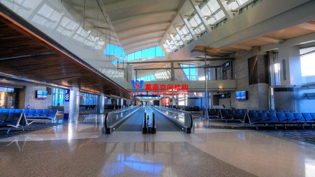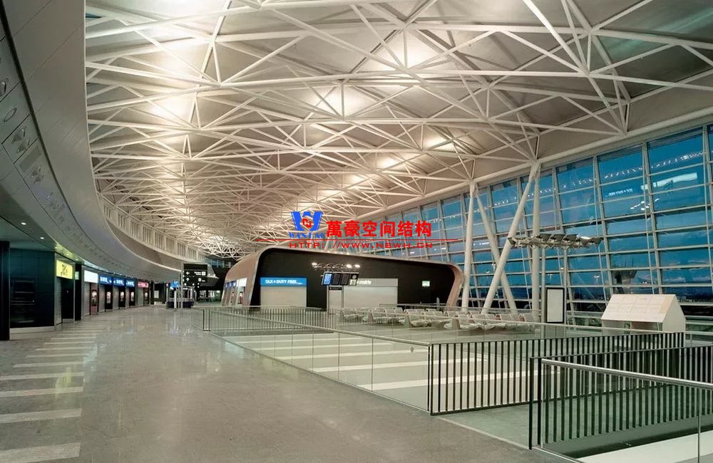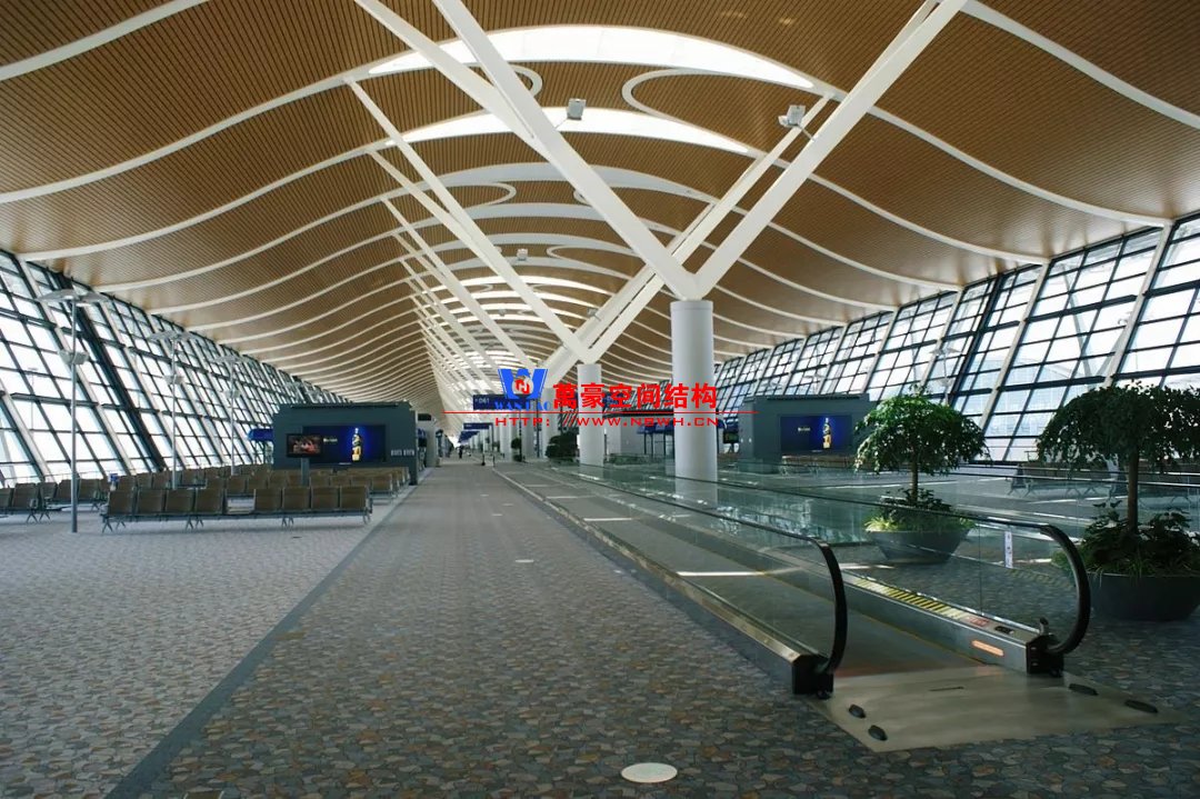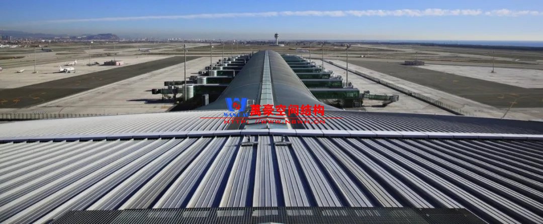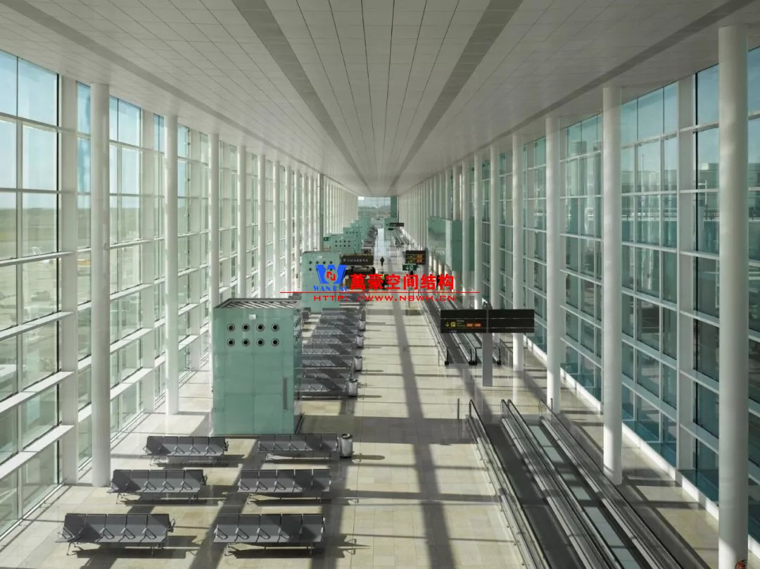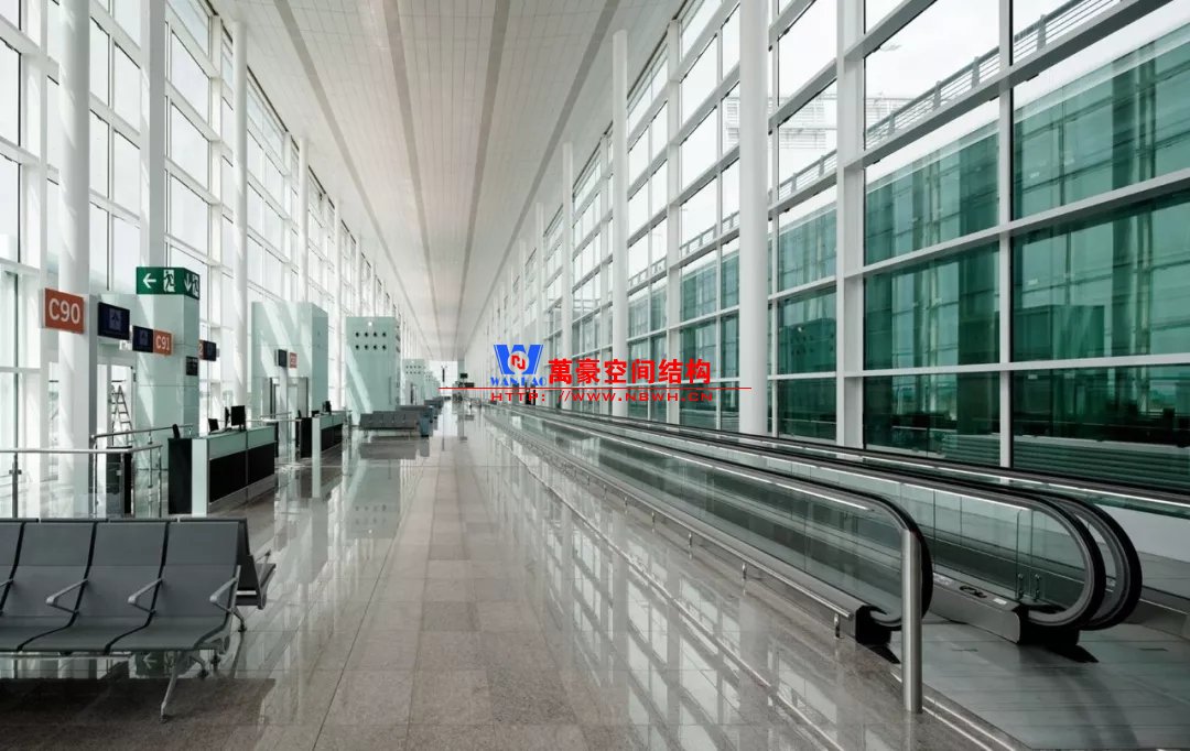 如巴塞羅那機(jī)場的指廊就是采用簡單的鋼框架結(jié)構(gòu)體系,鋼柱布置于兩邊;幕墻采用剛性幕墻,貼近鋼柱外側(cè)布置;室內(nèi)吊頂無天窗,吊頂走向沿長向,空間上有指向性。