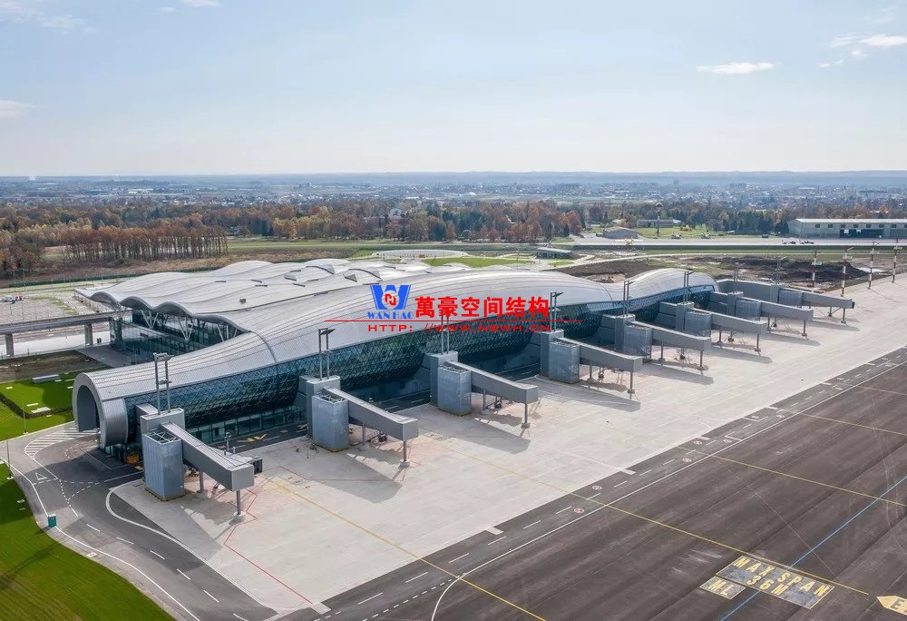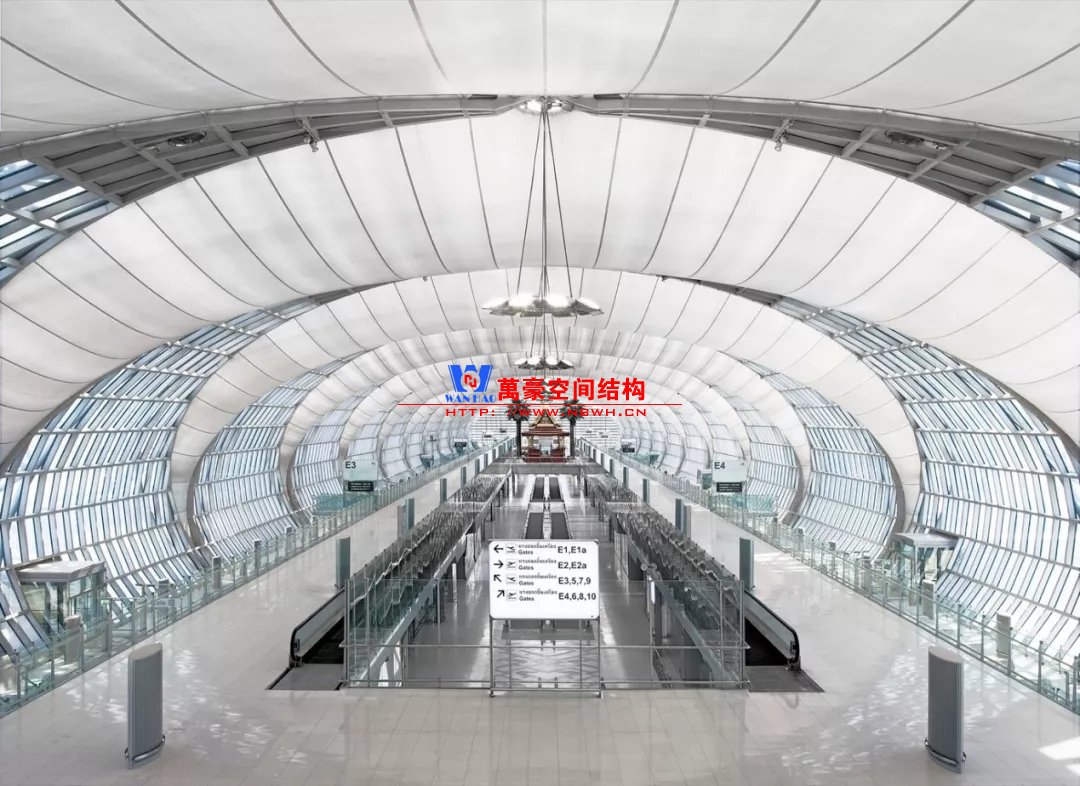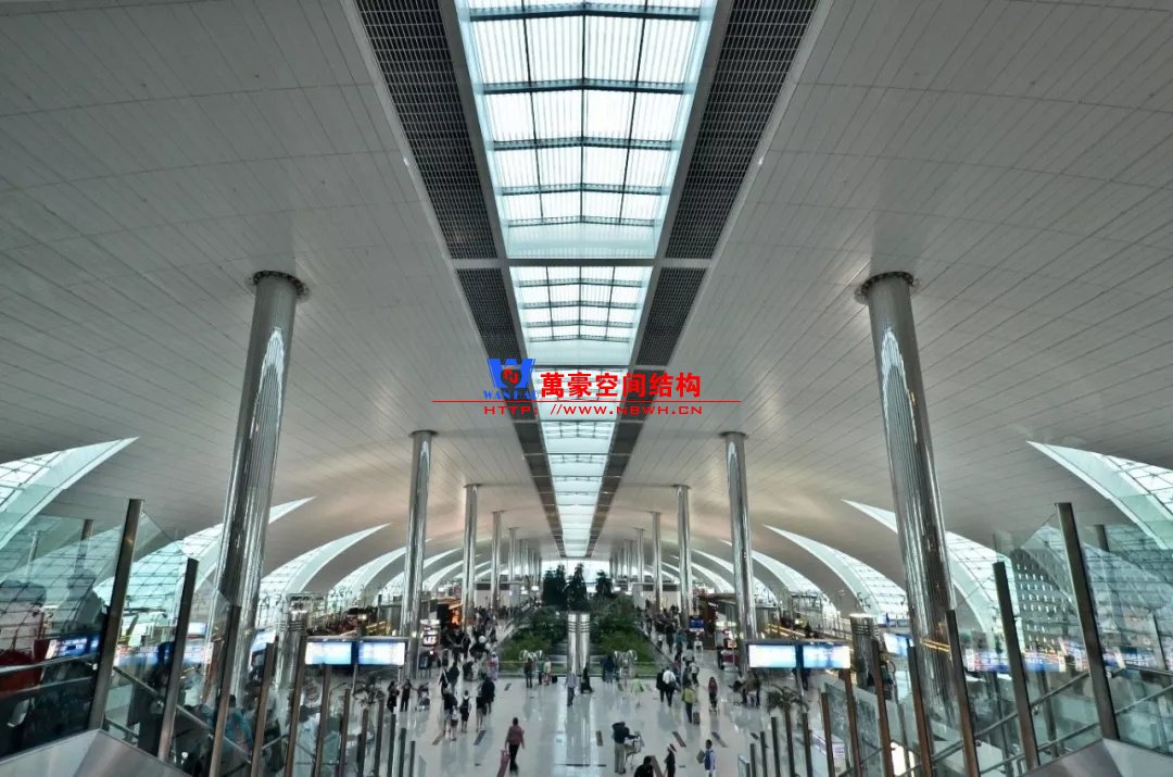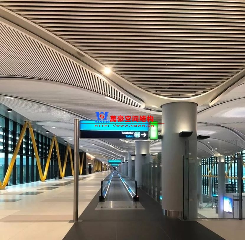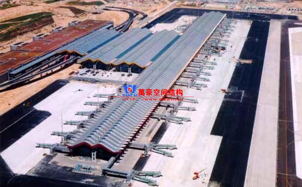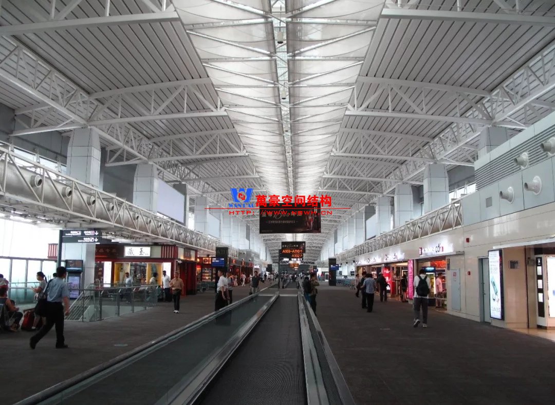 如巴塞羅那機(jī)場的指廊就是采用簡單的鋼框架結(jié)構(gòu)體系,鋼柱布置于兩邊;幕墻采用剛性幕墻,貼近鋼柱外側(cè)布置;室內(nèi)吊頂無天窗,吊頂走向沿長向,空間上有指向性。