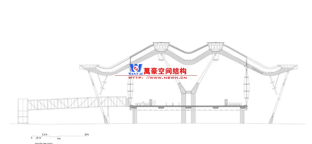我們還可以讓平頂有些起伏變化來增加室內(nèi)效果,比如經(jīng)典的馬德里機(jī)場。指廊的剖面采用M形,為了應(yīng)對曲梁帶來的不利影響,工程師在中部布置了兩組Y形柱支撐于轉(zhuǎn)折點。
