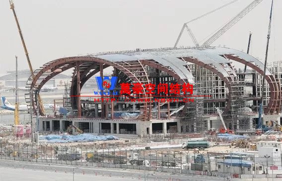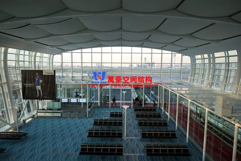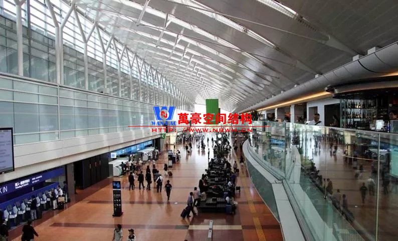 大阪關(guān)西機(jī)場則采用弧形鋼梁+索的結(jié)構(gòu)體系,有效減小了鋼梁尺寸,同時由于沒有天窗光線作用,鋼索并不明顯。可能是由于日本是地震多發(fā)地區(qū),外露的支撐構(gòu)件比較多略顯雜亂。