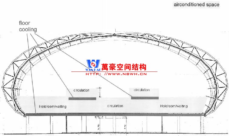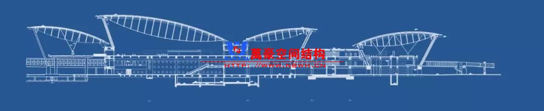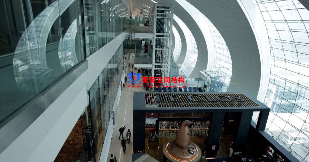 無獨有偶迪拜機(jī)場也是采用相似的外形,但是由于剖面并不是一個完整的拱形,因此構(gòu)件內(nèi)彎矩作用會比較明顯,因此在室內(nèi)布置了兩根柱子。立面幕墻則采用索桁架半剛性幕墻立面更加通透。與雙流機(jī)場不同,結(jié)構(gòu)構(gòu)件是吊頂外包的,因此外包區(qū)域采用了效率更高的主次梁體系。