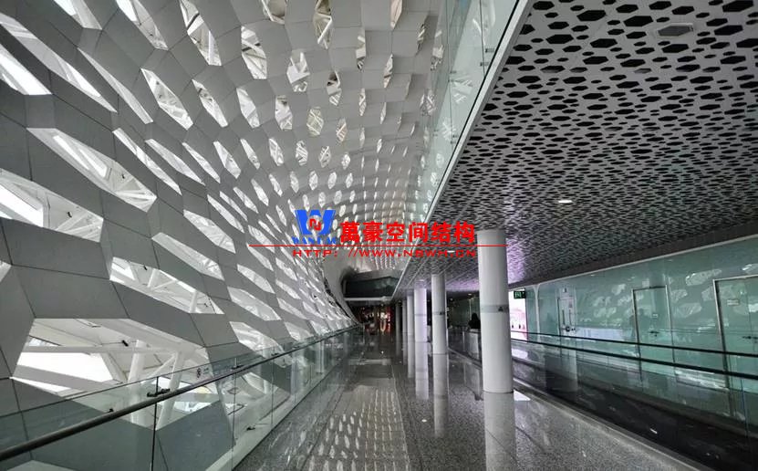 當(dāng)然也可以用萬能的桁架和網(wǎng)架去擬合筒形的曲面,但建筑的不同處理方法,會讓最終效果呈現(xiàn)出完全不同的感覺。如深圳寶安機(jī)場采用桁架+網(wǎng)架的結(jié)構(gòu)體系貼合建筑的上下表皮,最終建筑做吊頂外包,建筑吊頂采用鏤空的形式表達(dá)出建筑紋理,但在縫隙中可以看到結(jié)構(gòu)構(gòu)件。