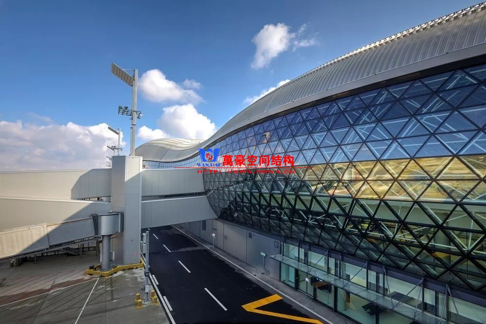 克羅地亞札格瑞布機(jī)場剖面也是筒形,結(jié)構(gòu)采用網(wǎng)架結(jié)構(gòu),但網(wǎng)架沒有外包。網(wǎng)架構(gòu)件和網(wǎng)架球節(jié)點直接暴露在近人的尺度,但從照片上看并沒有顯得很雜亂,這可能是因為結(jié)構(gòu)構(gòu)件和節(jié)點的尺度控制的很好,細(xì)而密的構(gòu)件顯得比較精細(xì)。