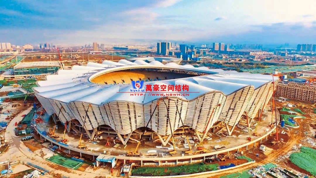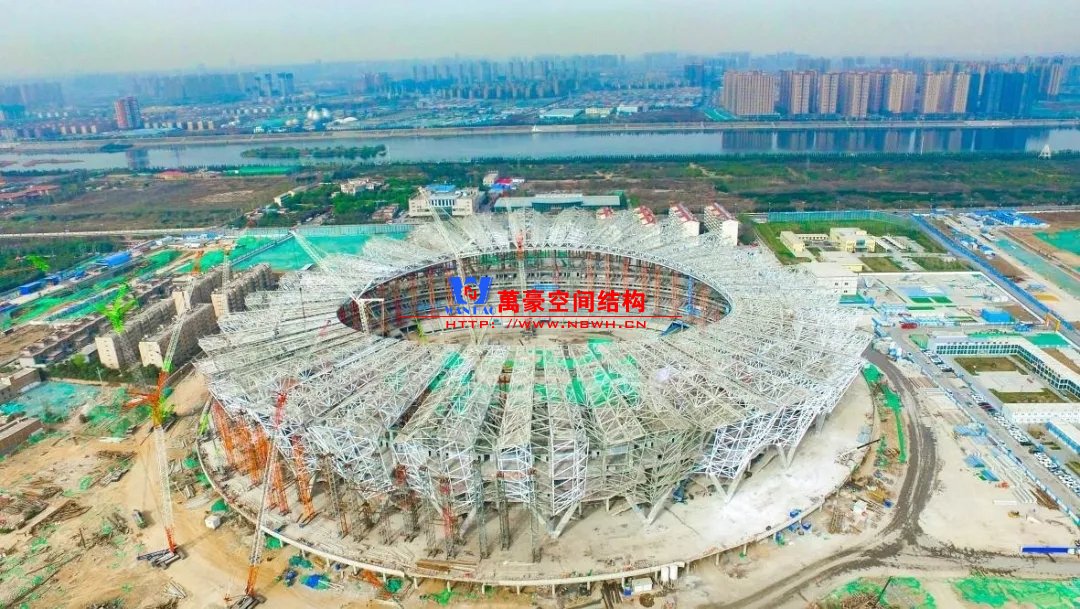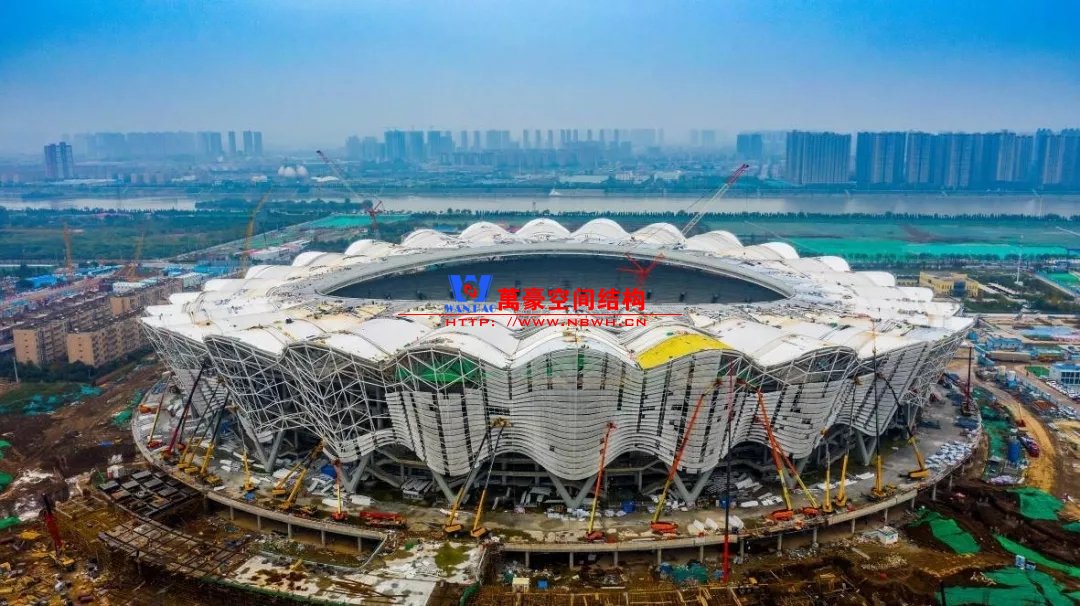 體育場罩棚整體造型呈馬鞍形,采用空間管桁架懸挑結(jié)構(gòu)體系,南北長332m,東西寬316m,罩棚最高58.3m。2019年1月1日首吊,鋼結(jié)構(gòu)分包中建鋼構(gòu)歷時(shí)87天,消耗近5萬工日、逾5千機(jī)械臺班,完成168單元、9500噸罩棚鋼桁架吊裝工作,于3月28日提前合攏。