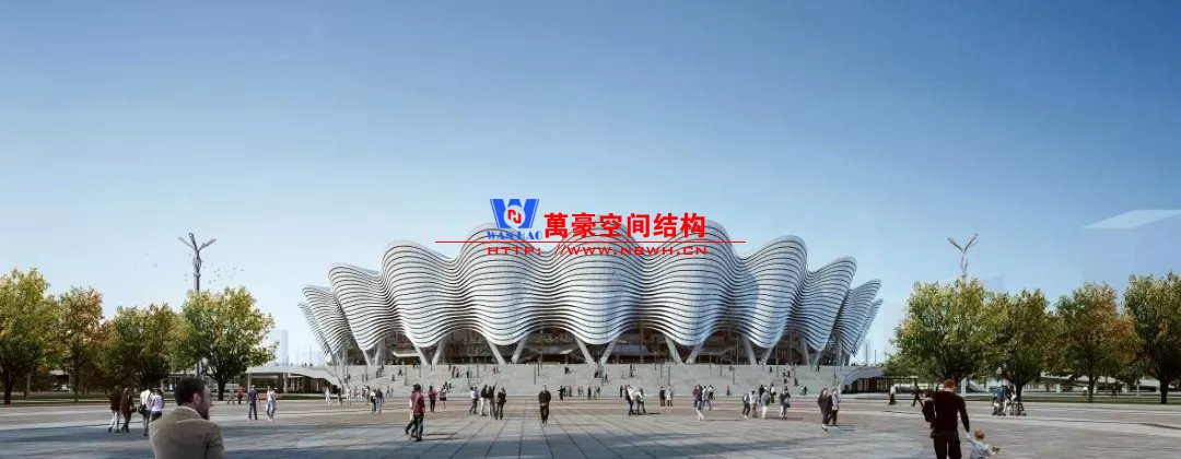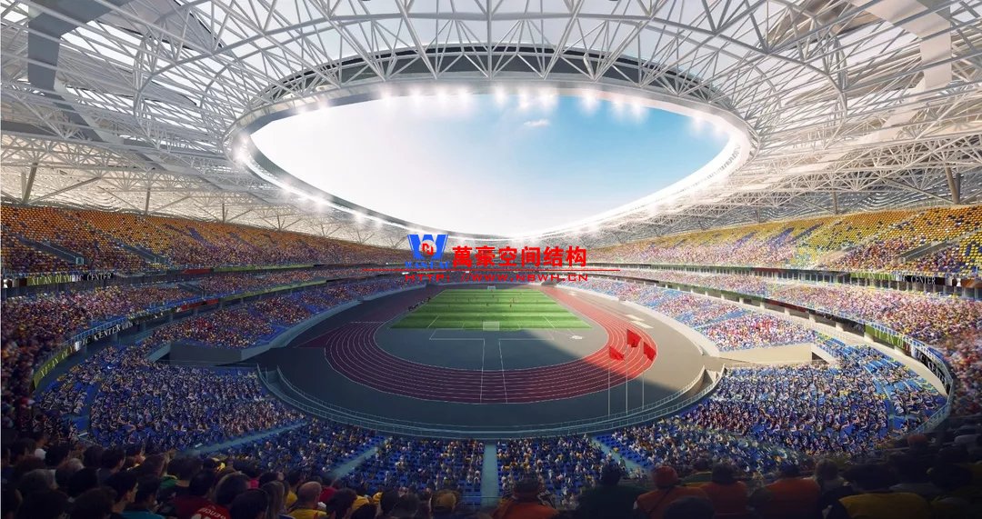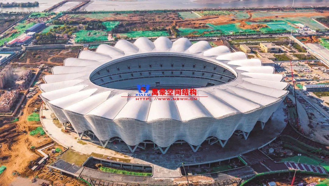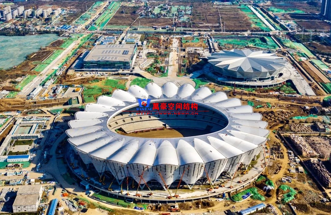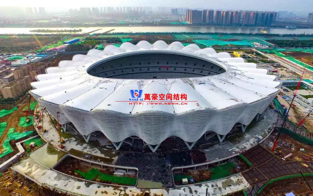 體育場主體建筑為南北長332m、東西寬316m的橢圓形,鋼結(jié)構(gòu)罩棚最高處高58.3m,最低處高42.6m;中間開口南北長200m、東西寬153m。主體鋼結(jié)構(gòu)采用空間懸挑鋼桁架結(jié)構(gòu),由28個(gè)V形柱支撐72片鋼結(jié)構(gòu)管桁架,整體東西高,南北低,呈馬鞍形,體育場看臺為框架-剪力墻體系。屋頂圍護(hù)結(jié)構(gòu)為鋁鎂錳直立鎖邊金屬屋面,罩棚立面采用銀白色穿孔鋁板幕墻系統(tǒng),通過有韻律的變化,表達(dá)了絲綢飄舞的動感,輕盈通透的罩棚在夜晚能夠透出賽場內(nèi)熱烈的賽事氣氛,宛如皓月長空下綻放的盛世之花。碗型看臺分為上、中、下三層座席,并在中上層看臺之間設(shè)置包廂層(包括66個(gè)大小包廂)及其座席區(qū),觀眾分別由各層看臺對應(yīng)的通道進(jìn)入。
