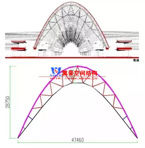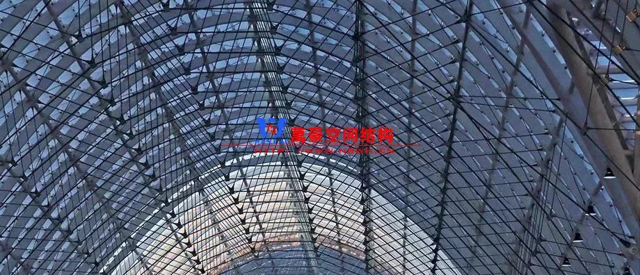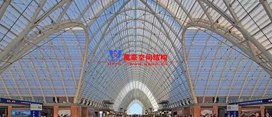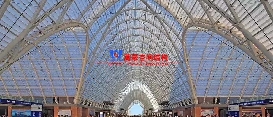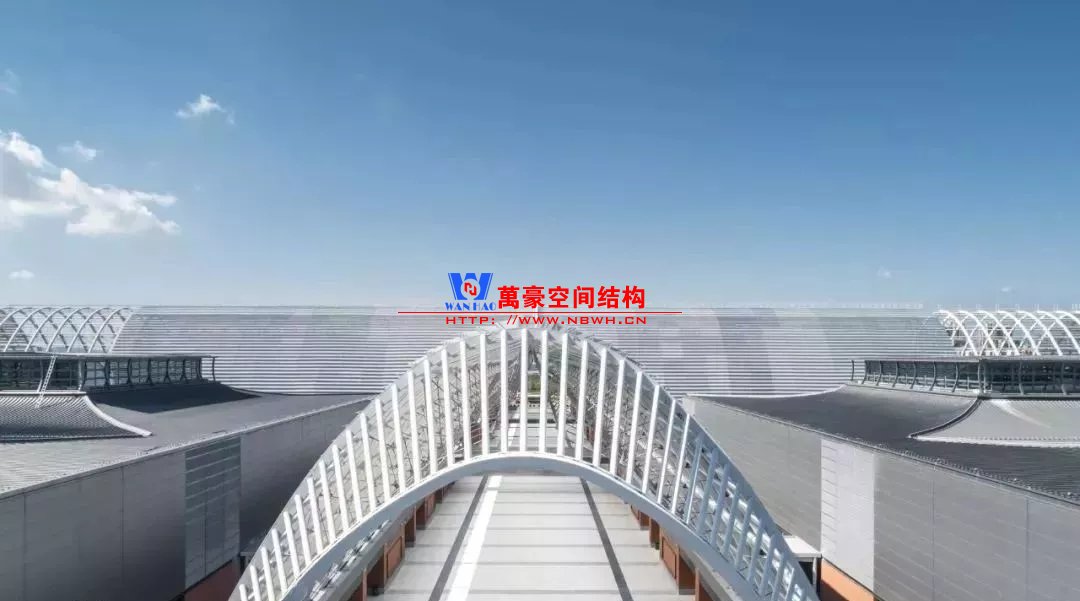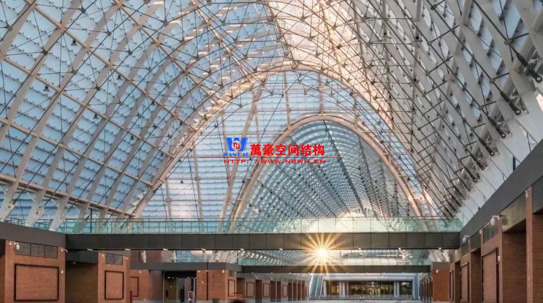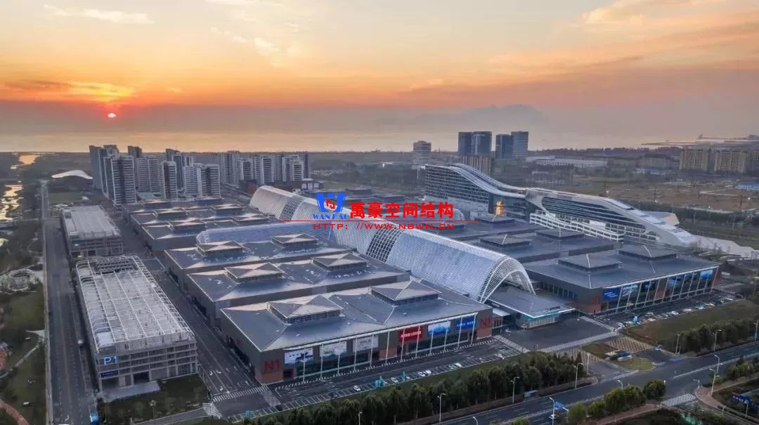 建筑內(nèi)在的空間結(jié)構(gòu)形成了外部形態(tài)的美學(xué)韻律和視覺沖擊力,使建筑形象真實(shí)而動(dòng)人。包括展廊與展廳兩部分,以中央十字展廊為功能組織核心,南北各布置6個(gè)、共12個(gè)獨(dú)立展廳單元(尺寸74.4m×136.4m,采用變標(biāo)高的空間桁架鋼結(jié)構(gòu))。展廊平面呈十字型布置,東西向長507m,南北向長287m,主拱和次拱方向分別設(shè)置兩道溫度縫,最高點(diǎn)標(biāo)高為35.0m。