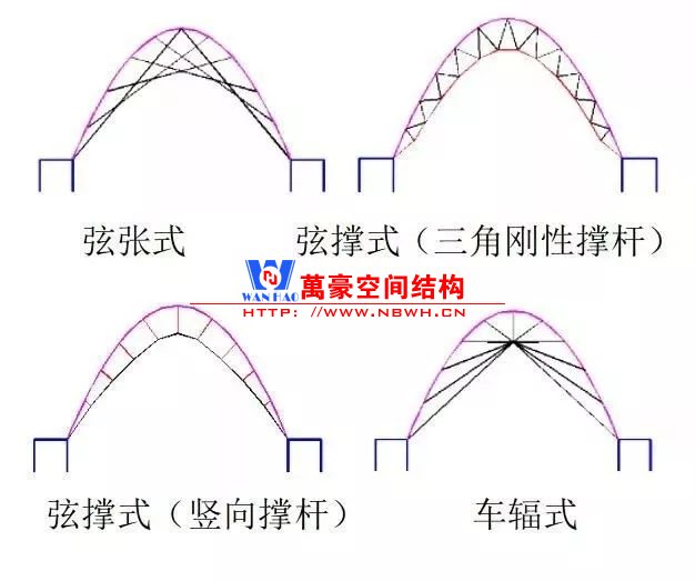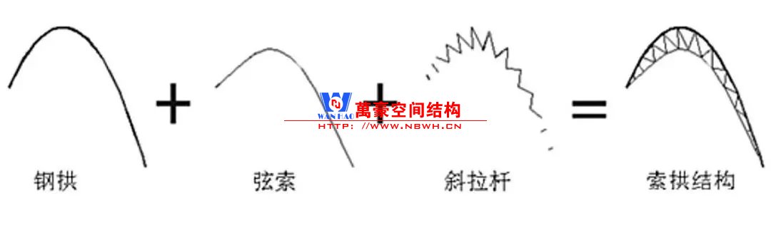 下部主體結(jié)構(gòu)為混凝土框架體系,地上一層,局部設(shè)置一層地下室。十字展廊屋蓋結(jié)構(gòu)為預(yù)應(yīng)力索拱結(jié)構(gòu),索拱平面外順柱面網(wǎng)殼沿縱向利用高強(qiáng)鋼拉桿通長設(shè)置交叉支撐,以保障索拱面外的穩(wěn)定。