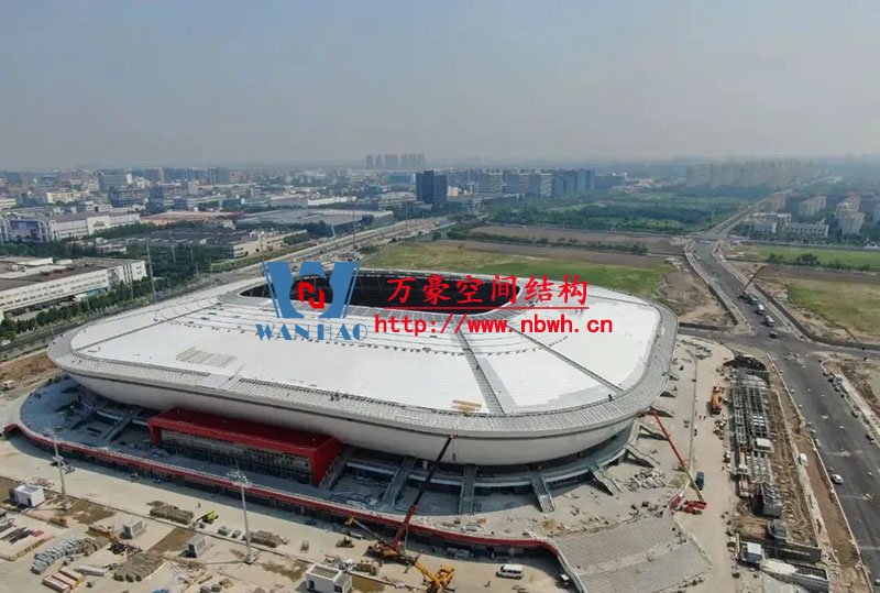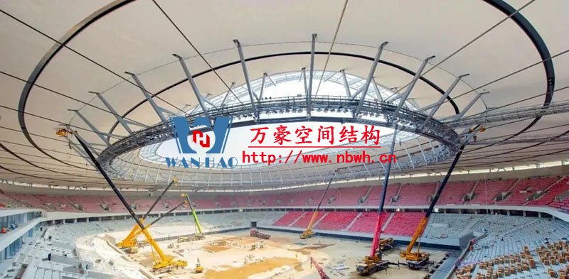 球場(chǎng)的屋蓋采用了預(yù)應(yīng)力輪輻狀張拉體系,就像一個(gè)自行車(chē)的輪轂橫著蓋在了球場(chǎng)上方,最大特點(diǎn)是用鋼結(jié)構(gòu)和索網(wǎng)結(jié)合,取代了以往比較沉重、繁瑣的鋼桁架體系,最大的好處就是輕量化,整個(gè)屋蓋的用鋼量在4600噸左右,相比以往傳統(tǒng)的建造方式,在用鋼量上大約減少了50%。