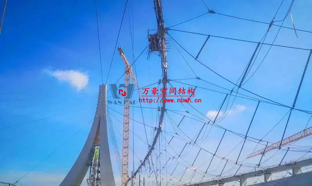 索膜罩棚結(jié)構(gòu)由2.2萬米拉索、219噸索夾節(jié)點、3.3萬平米PTFE膜共同構(gòu)成,如何平衡“天傘”索網(wǎng)結(jié)構(gòu),提升張拉過程中拉索產(chǎn)生的拉力?如何確保索網(wǎng)張拉成形過程中,索桁架體系穩(wěn)定?這是建設(shè)者實施索網(wǎng)張拉,需要攻克的核心技術(shù)難題。