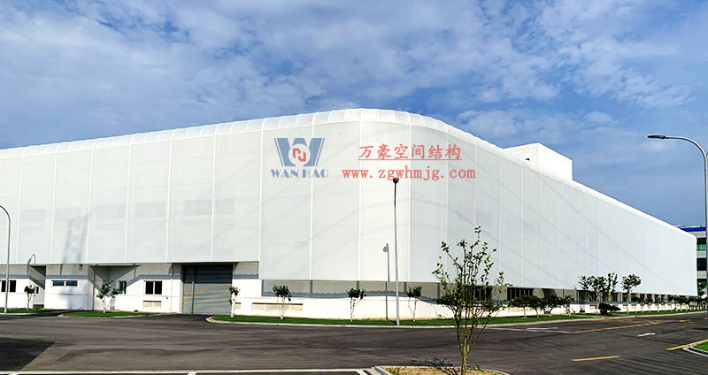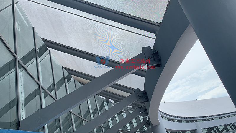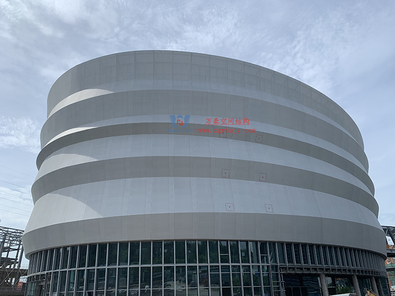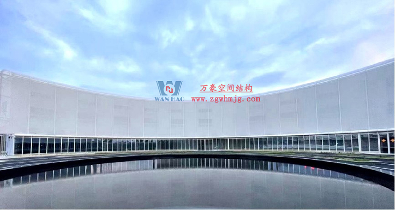 由萬豪承建的紹興國(guó)際會(huì)展館中心外立面網(wǎng)格織物膜,由5凸5凹不同標(biāo)高的柔線組合成飄絲帶,視覺效果極具沖擊力。
