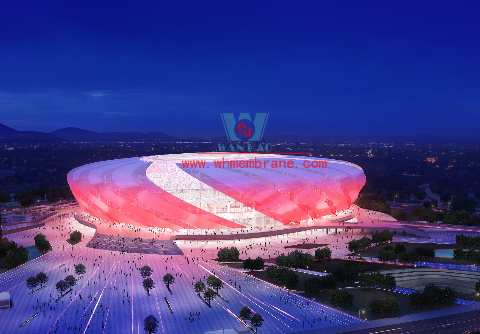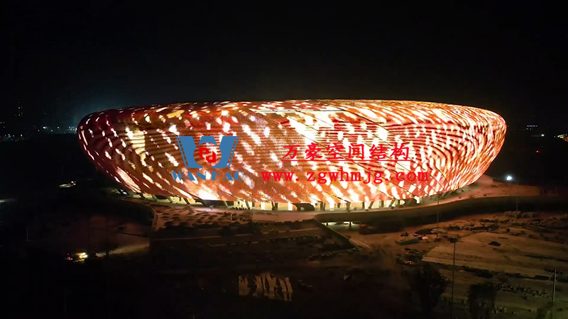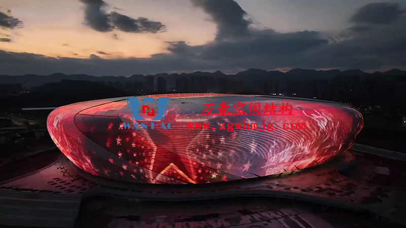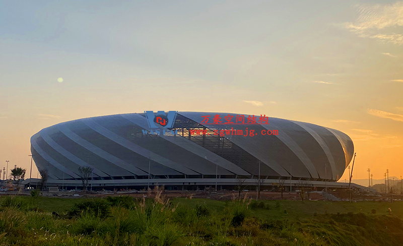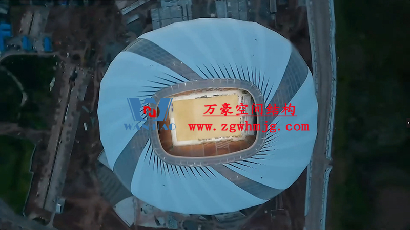 重慶龍興足球場項目位于重慶市兩江新區(qū),占地面積約303畝,總建筑面積約17萬平方米。足球場鋼屋蓋平面呈橢圓形,南北投影長283米、東西寬252米,屋面最大高度59.5米。該項目部分屋面材料選用進口高自潔ETFE膜材, 膜結(jié)構展開面積合計30000平米。