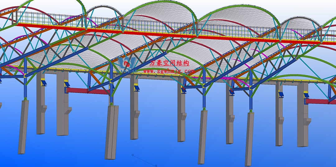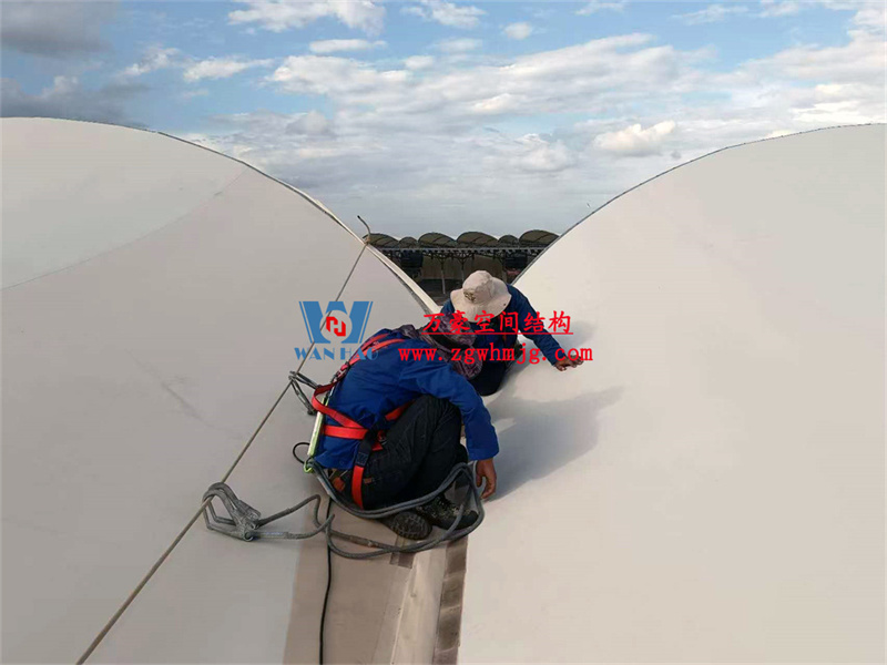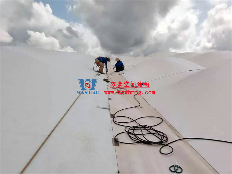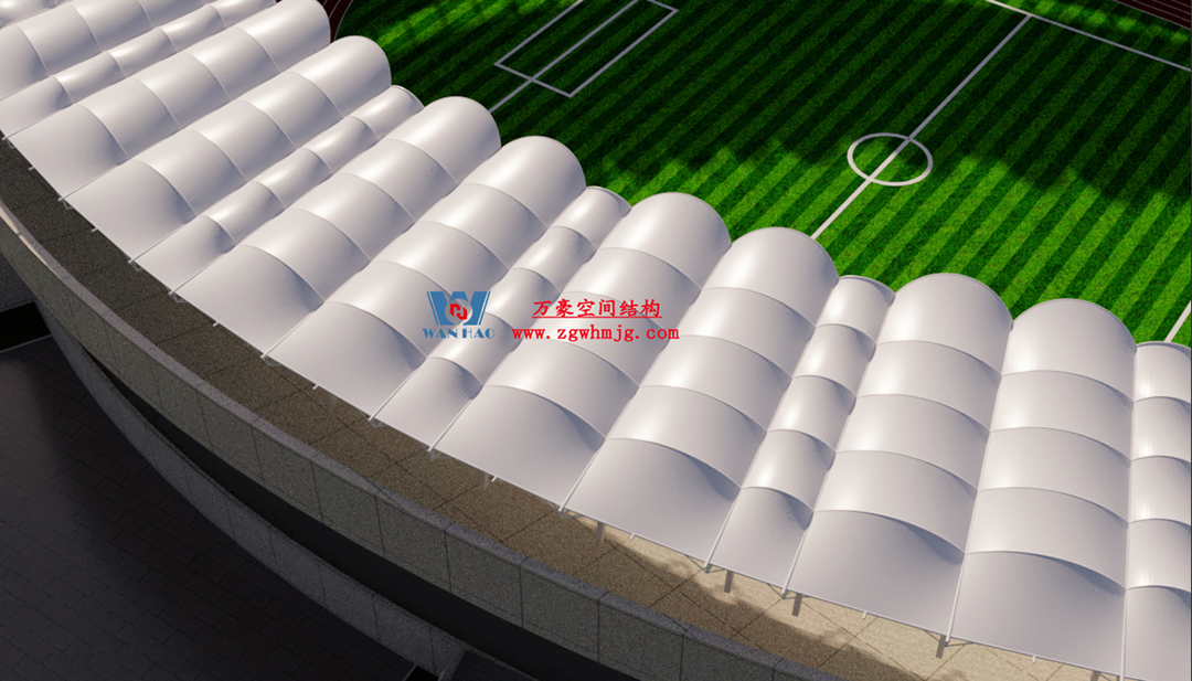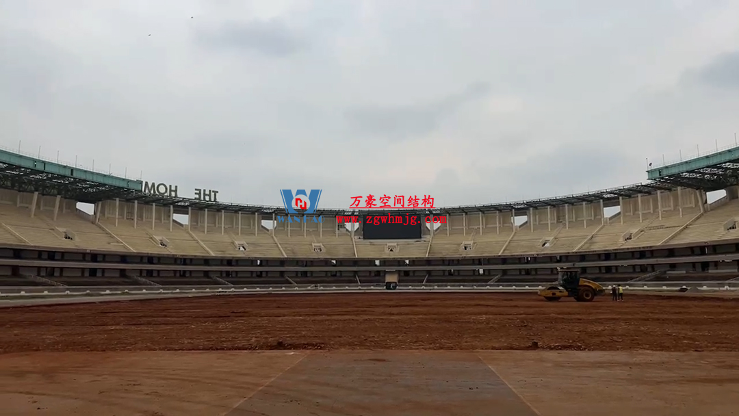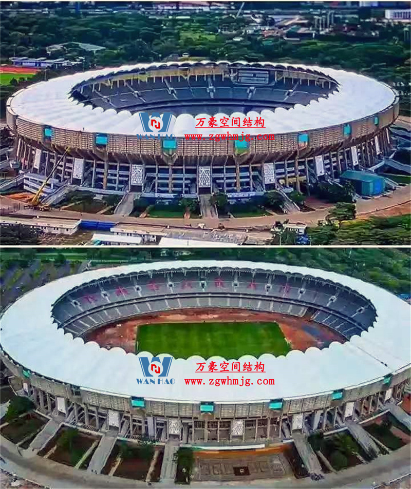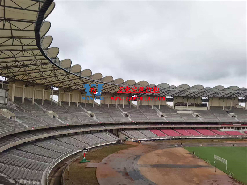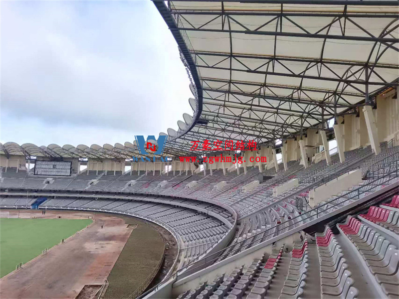 容納3萬人肯尼亞內(nèi)羅畢(非洲杯)足球體育場,屬于整體性改擴建項目,因體育場投入使用30余年,原設(shè)施落后陳舊,改造設(shè)計要求充分考慮原基礎(chǔ)結(jié)構(gòu)安全。項目前期需要進行基礎(chǔ)立柱定位,結(jié)構(gòu)屋面拆除等相關(guān)工作,并通過科學有效的技術(shù)措施處理,3D掃描,健康檢測,建模分析等,經(jīng)過多輪方案比選后,最終選擇PTFE膜屋面大懸挑空間結(jié)構(gòu)。主體桁架懸挑45米,橫向聯(lián)系向上起拱,屋面采用高自潔PTFE膜結(jié)構(gòu),開口式體育場內(nèi)部視野空曠無遮擋,讓非洲人民足球夢想在這里展翅高飛。該項目作為2026年非洲杯足球賽體育場之一投入使用,改擴建設(shè)計生產(chǎn)施工全部由萬豪團隊完成,充分體現(xiàn)了萬豪的設(shè)計施工服務能力,也為海外市場的拓展奠定了扎實的基礎(chǔ)。