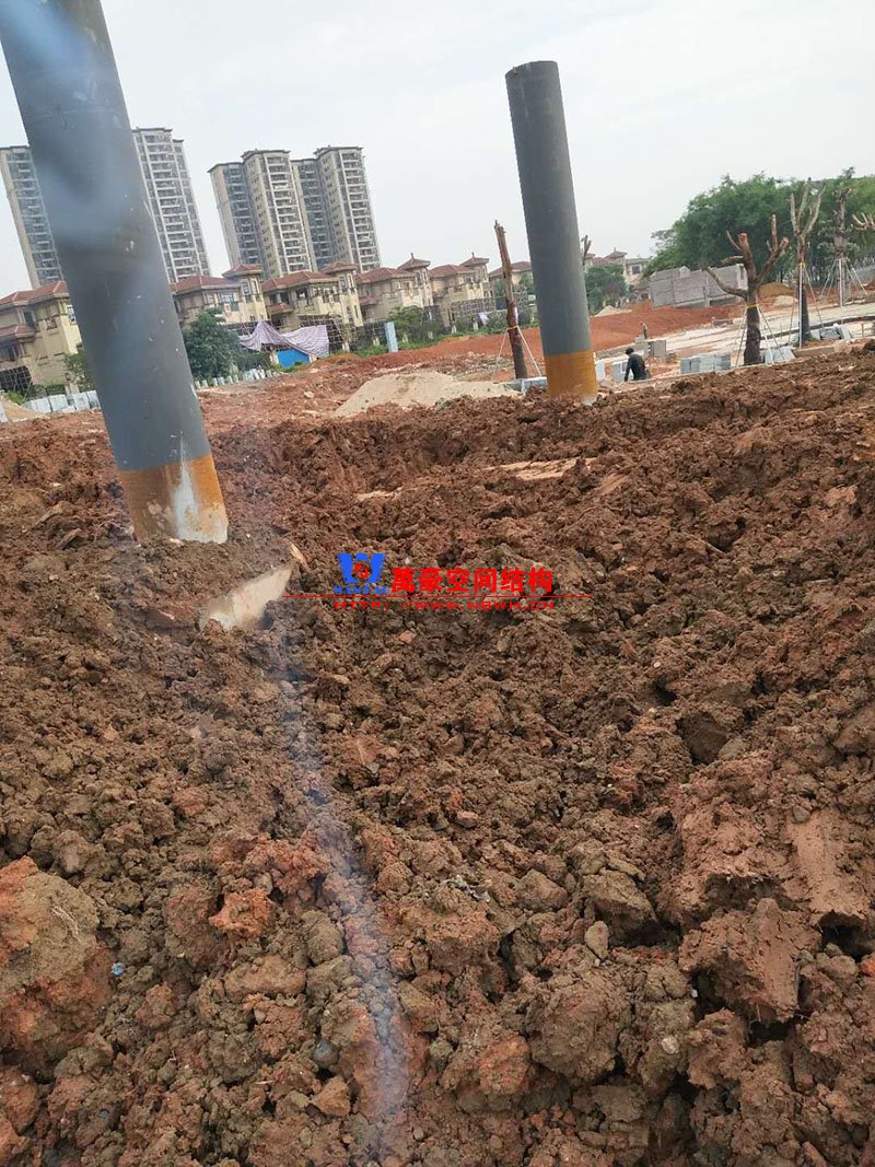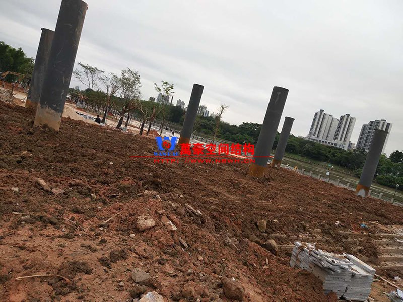 廣場鋼拉膜項(xiàng)目由六個(gè)龍船花造形景觀組成,每個(gè)龍船花景觀造形立柱的高度不得低于3.80米,花瓣造形最低高度 7.54米,花瓣造形最高高度9.608米,膜結(jié)構(gòu)屋面材質(zhì)為 PTFE網(wǎng)格基布雙面貼透明ETFE建筑膜材。目前立柱已安裝完成,準(zhǔn)備開始安裝其它構(gòu)件。