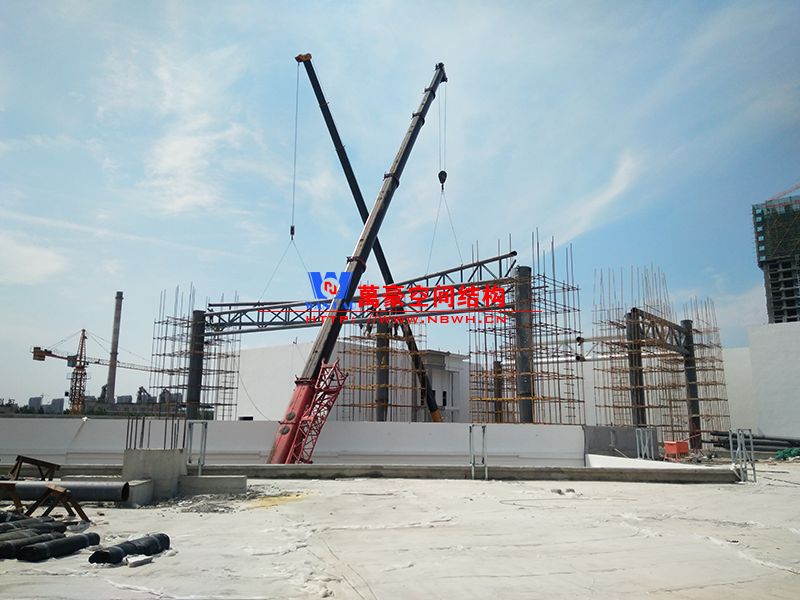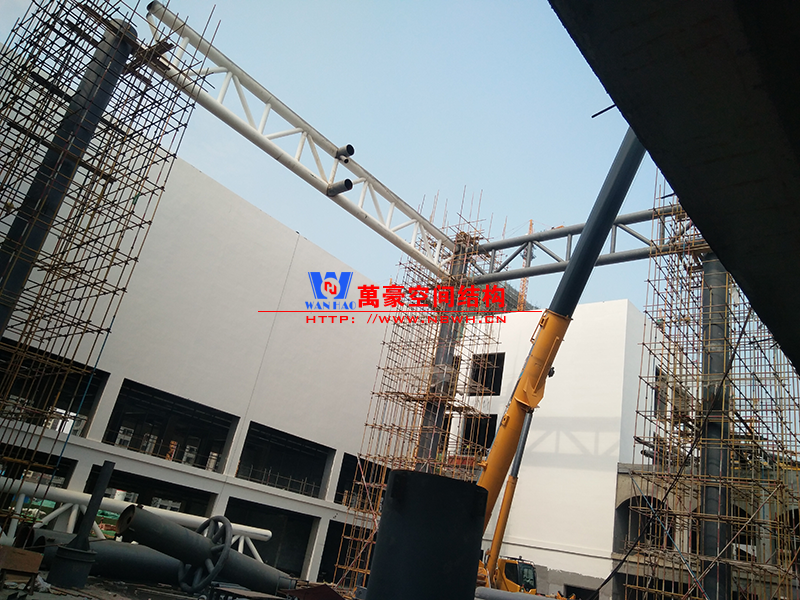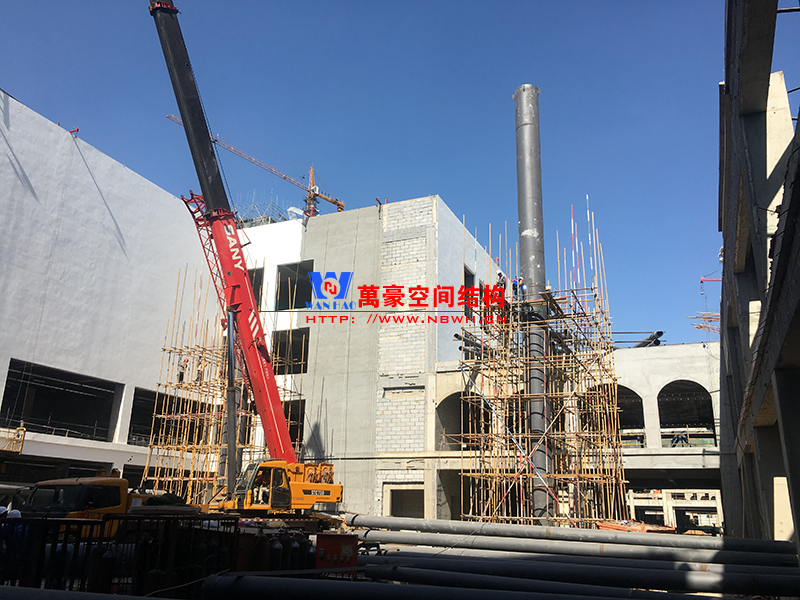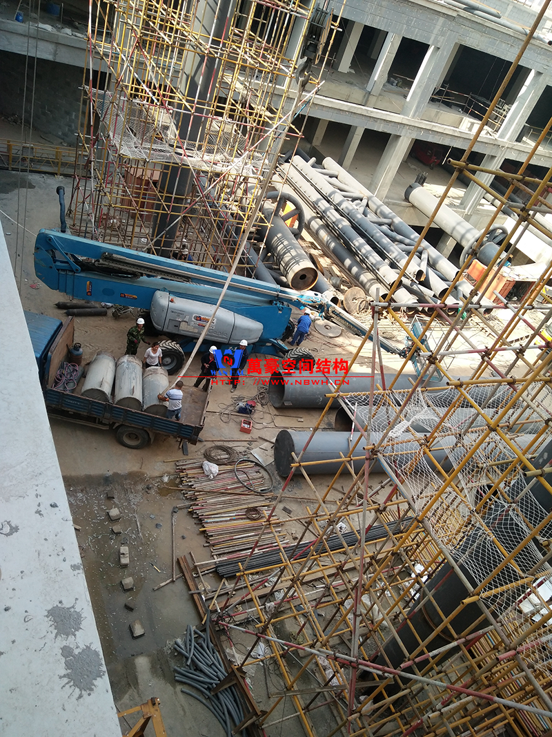 目前一號云朵鋼柱立起3根,懸挑管架全部拼裝完畢,桁架拼裝完成;二號云朵鋼柱立起3根,桁架、漏斗已基本到位,懸挑構件焊接中;三號云朵鋼柱焊接中,隔板、環(huán)板正在有序拼裝。