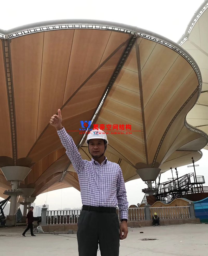 然后,我們觀摩學(xué)習(xí)了聊城歡樂(lè)小鎮(zhèn)七彩云朵項(xiàng)目膜結(jié)構(gòu)工程,該項(xiàng)目PTFE膜結(jié)構(gòu)工作基本完成,進(jìn)入最后搶工期階段。