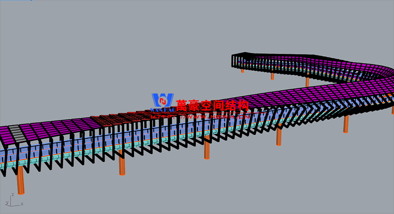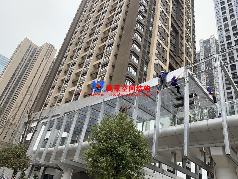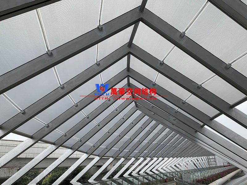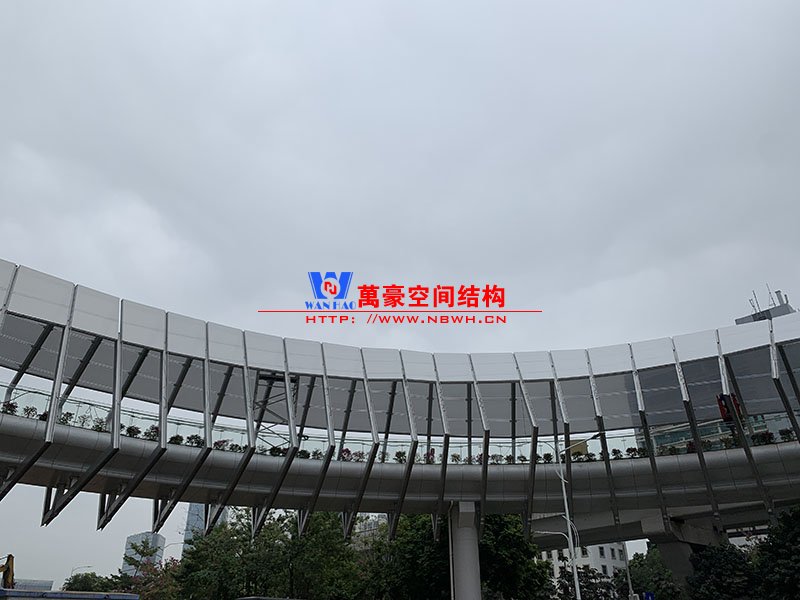深圳龍崗三館一城項目市政配套工程1號連廊膜結(jié)構(gòu)工程項目為單層ETFE膜結(jié)構(gòu),共劃分為101個單元,總面積約為2000㎡,由寧波萬豪空間結(jié)構(gòu)工程有限公司承建。膜結(jié)構(gòu)原材采用德國NOWOFOL-300μm鍍點ETFE材料,保證透光率的同時,兼顧防范紫外線。膜結(jié)構(gòu)四周利用鋁合金夾具固定于主鋼結(jié)構(gòu)二次構(gòu)件上,膜面采用PE鋼索輔助支撐,確保膜面有效承擔(dān)相應(yīng)動荷載。