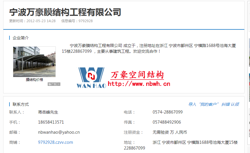 以下名為寧波萬豪膜結(jié)構(gòu)工程有限公司的相關(guān)信息,與本公司無任何關(guān)系。