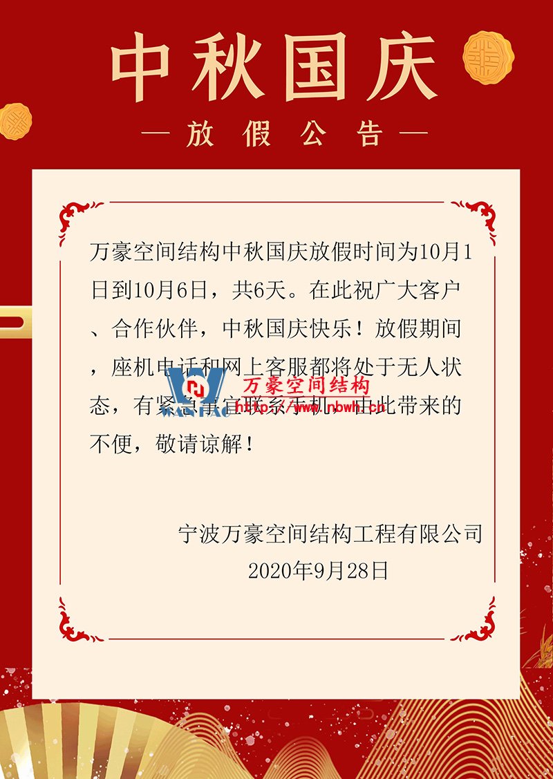 萬(wàn)豪空間結(jié)構(gòu)中秋國(guó)慶放假通知