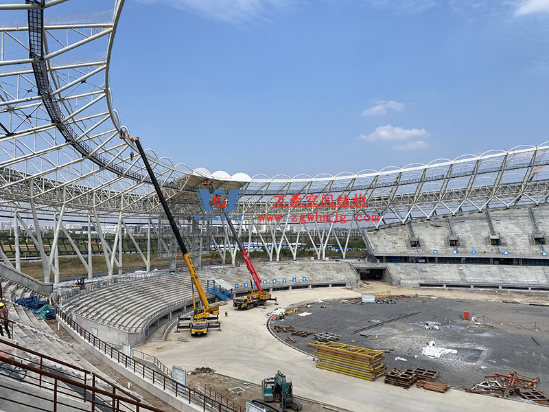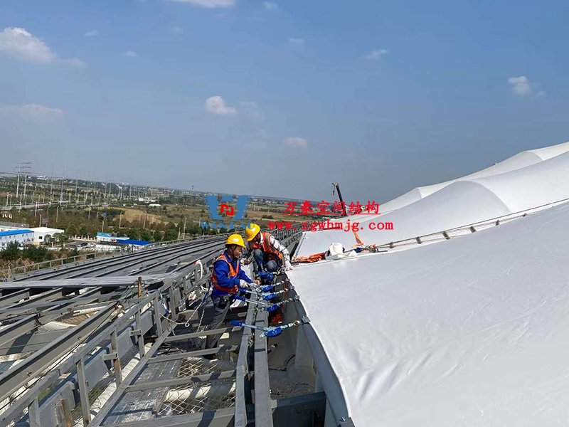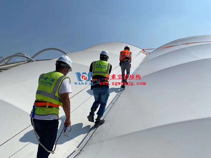 襄陽奧體中心PTFE膜結(jié)構(gòu)屋面歷經(jīng)幾個(gè)月的緊張工作,已經(jīng)全面投入高峰期作業(yè)。在最高溫的天氣夾雜著汗水和最熱情的狀態(tài)譜寫著萬豪空間結(jié)構(gòu)的故事,所謂藝高人膽大高瞻遠(yuǎn)矚,現(xiàn)場(chǎng)的每一個(gè)人通過自己最樸實(shí)的勞動(dòng)方式贏得各方尊重。