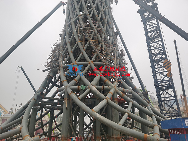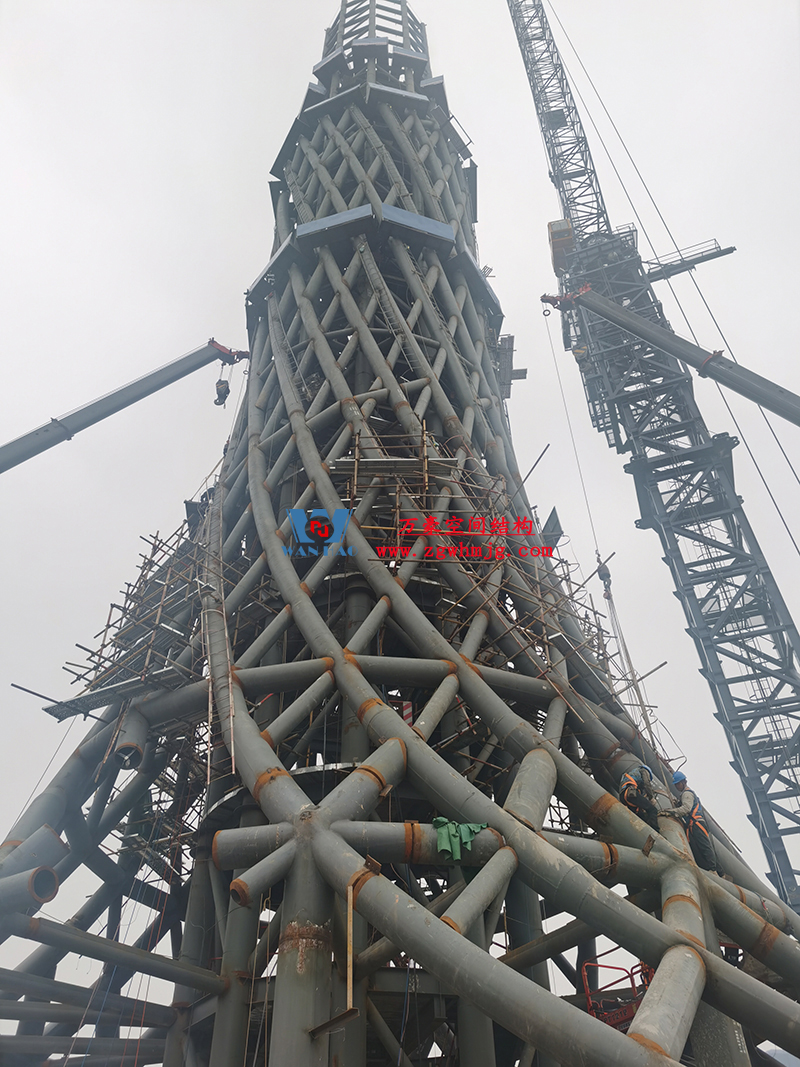 塔身為筒中筒鋼結(jié)構(gòu),內(nèi)筒為等間距布置的10根豎柱和水平梁組成,外筒為雙向螺旋交織的菱形網(wǎng)格曲線空間鋼結(jié)構(gòu),形似廣州小蠻腰,呈現(xiàn)“纖纖細腰,不盈一握”的驚人審美效果,也與中國傳統(tǒng)審美觀相契合。