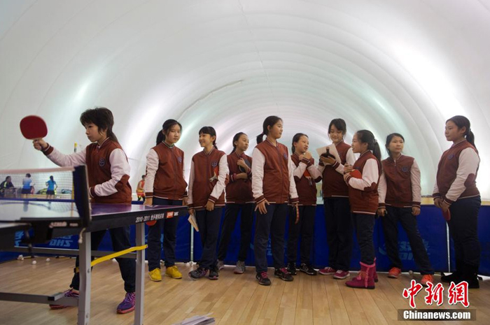 12月1日,一群學(xué)生在北京市某學(xué)校充氣膜體育館學(xué)習(xí)乒乓球。 (來自:中國新聞網(wǎng))