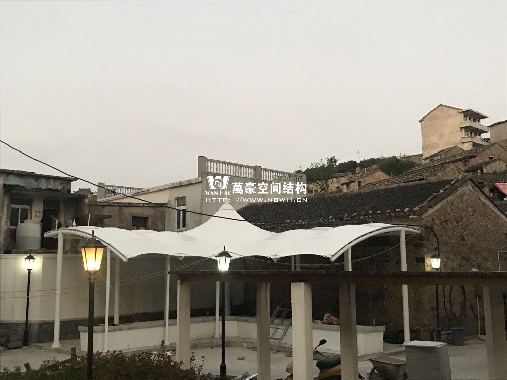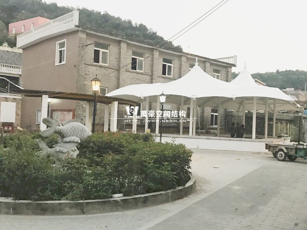 大陳島海鮮膜結構工程位于下大陳島衛(wèi)星村步行街后半段(臺州雷力建設有限公司對面),該工程由我司現(xiàn)場考察、多次深化、制作及安裝,設計抗臺等級12級,鋼構最高點高度達6.5米;