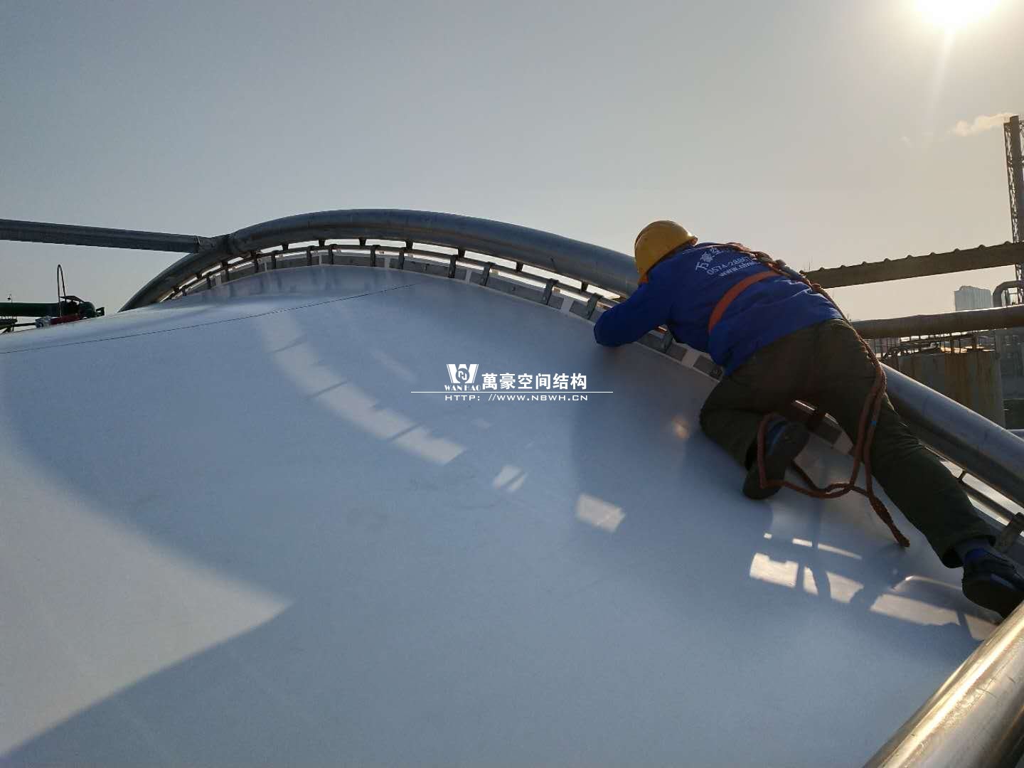 東廠區(qū)生化池加蓋工程,坐落于浙江省紹興市杭州灣上虞經(jīng)濟(jì)開發(fā)區(qū)龍盛科技園內(nèi)。整個項(xiàng)目由A/O池加蓋4座、二沉池加固定蓋4座、濃縮池加蓋2座、氧化池加蓋1座、氧化氣浮池加蓋1座、氧化集水池加蓋1座、出水調(diào)節(jié)池1座、安諾池1座,共計(jì)15座鋼膜結(jié)構(gòu)組成。總用鋼量達(dá)350噸,總建筑面積達(dá)35000平方米。