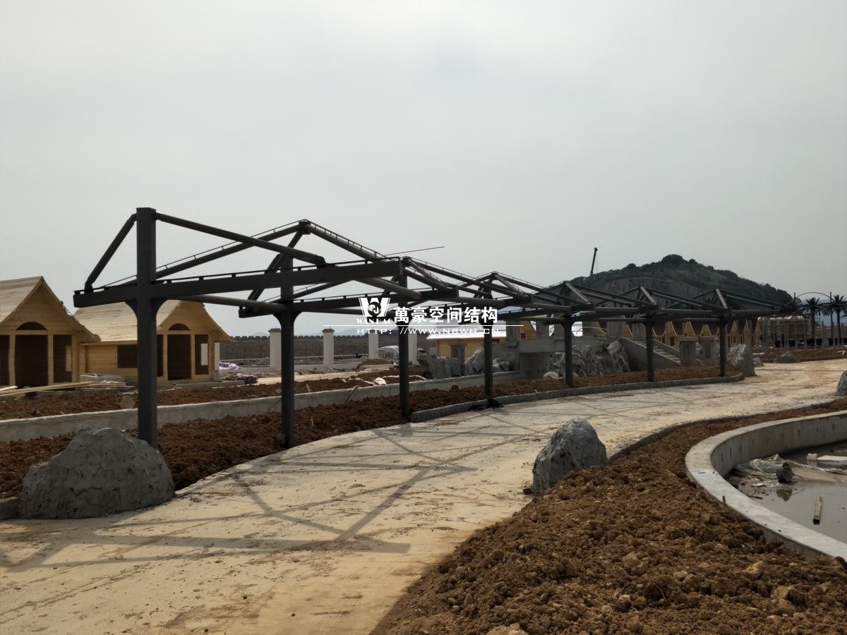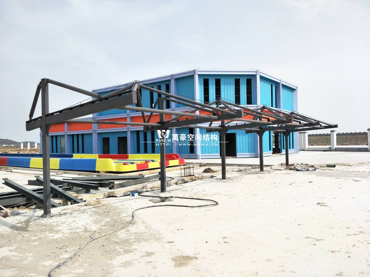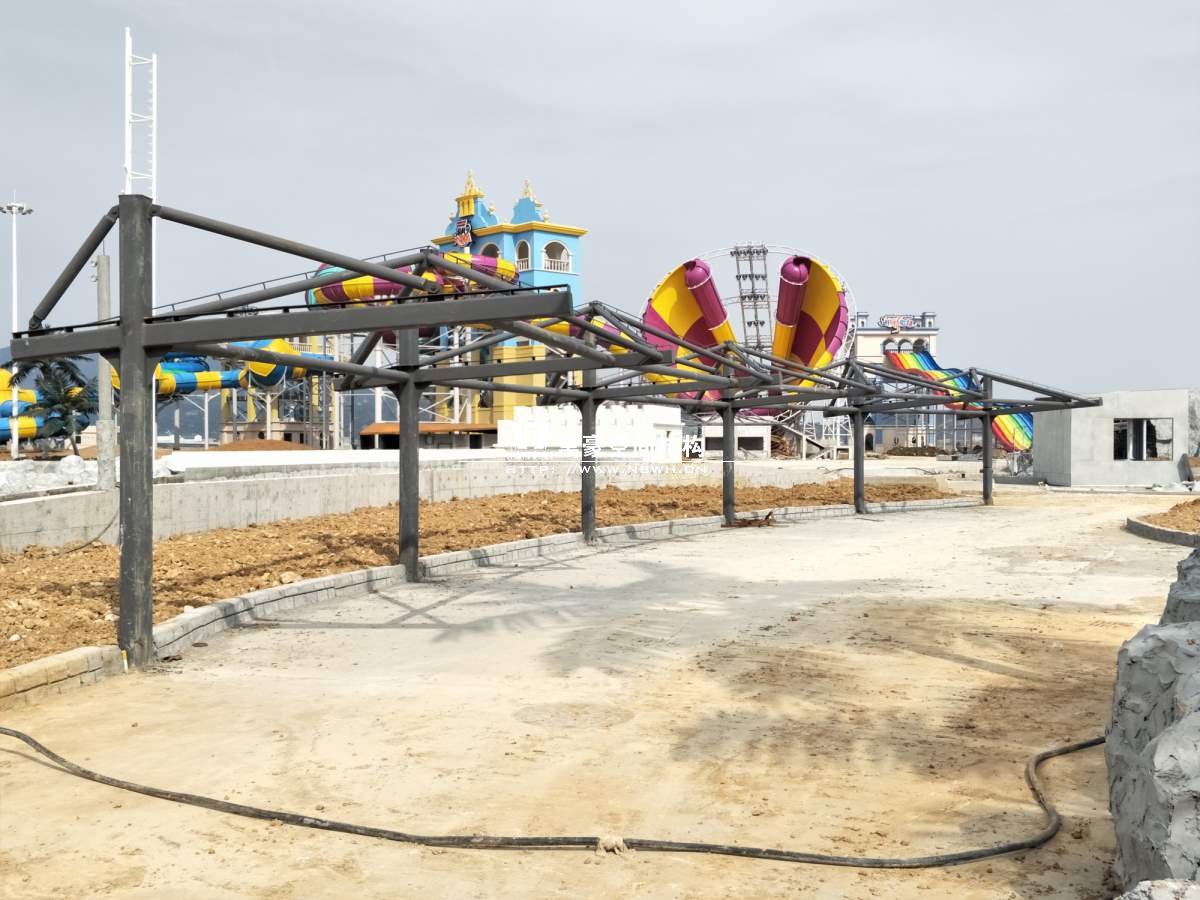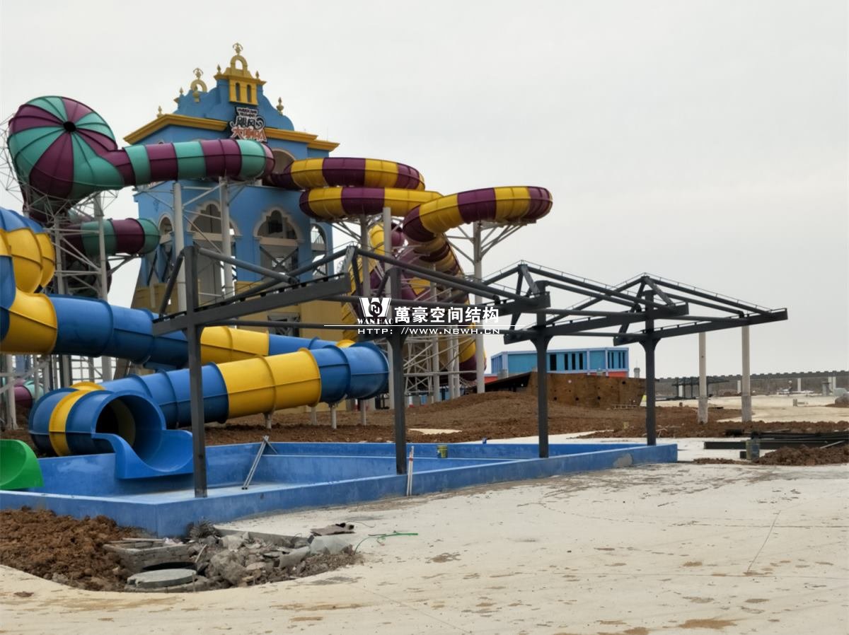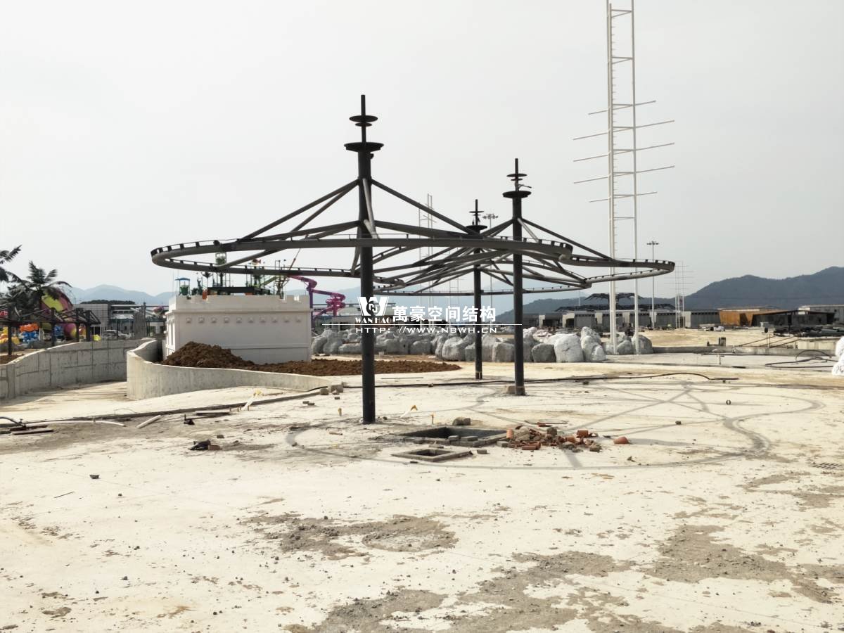 海闊天涳水世界鋼膜結(jié)構(gòu)工程,由寧波萬豪空間結(jié)構(gòu)工程有限公司承建。現(xiàn)場測量、深化設(shè)計(jì)、制作及安裝由寧波萬豪空間結(jié)構(gòu)工程有限公司全權(quán)負(fù)責(zé);用鋼量高達(dá)180噸,建筑面積達(dá)5000平米。